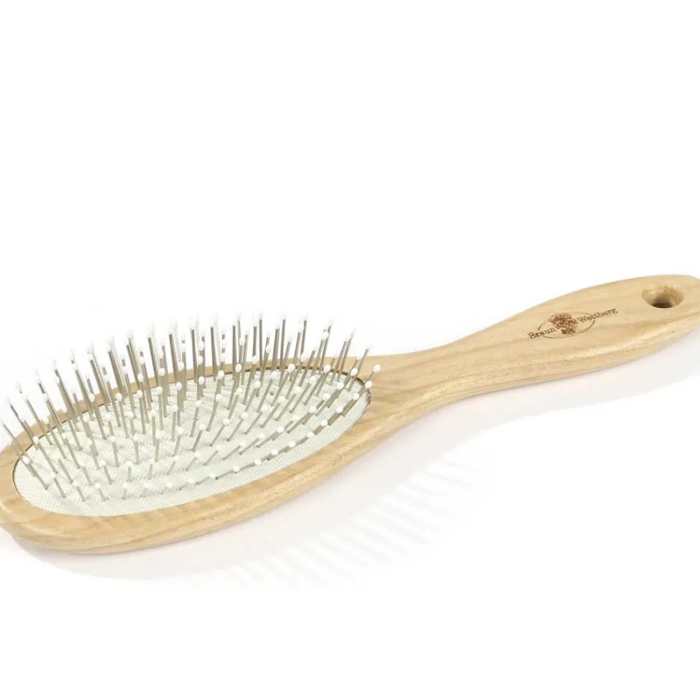 Die Braun & Wettberg Kirschholzbürste groß – Drahtstifte ist aus FSC-zertifiziertem Kirschholz gefertigt und verfügt über Drahtstifte mit weißen Noppen.