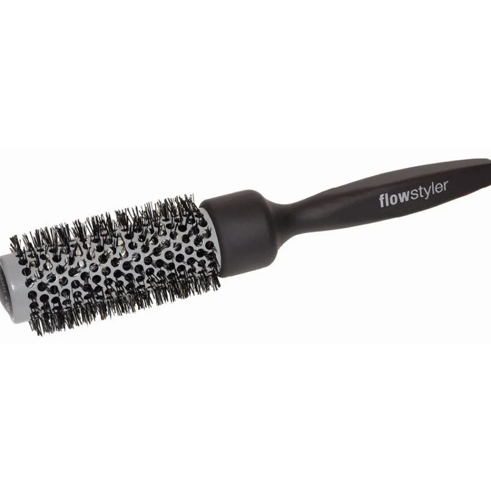 Der Canal Flowstyler Buchenholz, 33 mm Hülse, 45 mm Borste hat einen Durchmesser von 33 mm, eine Keramikhülse, einen Holzkern und ist mit Soft-Touch Lackierung.