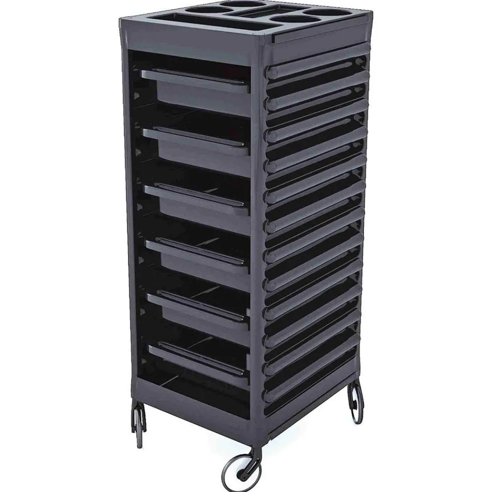 Der Ceriotti Arbeitswagen Easy Schwarz ist aus Polypropylen, ein wasserdichter und hitzebeständiger Kunststoff. Für ein einfaches Arbeiten können die 6 abnehmbaren Arbeitskästen zusätzlich an der Seite platziert werden. Inklusive 2 Halter für Trockner/Zubehör und eine funktionale Arbeitsplatte mit integrierten Aussparungen fürFärbeschalen und Arbeitsutensilien. Abnehmbare Anti-Haar Rollen verhindern, dass die drehenden Räder blockieren.