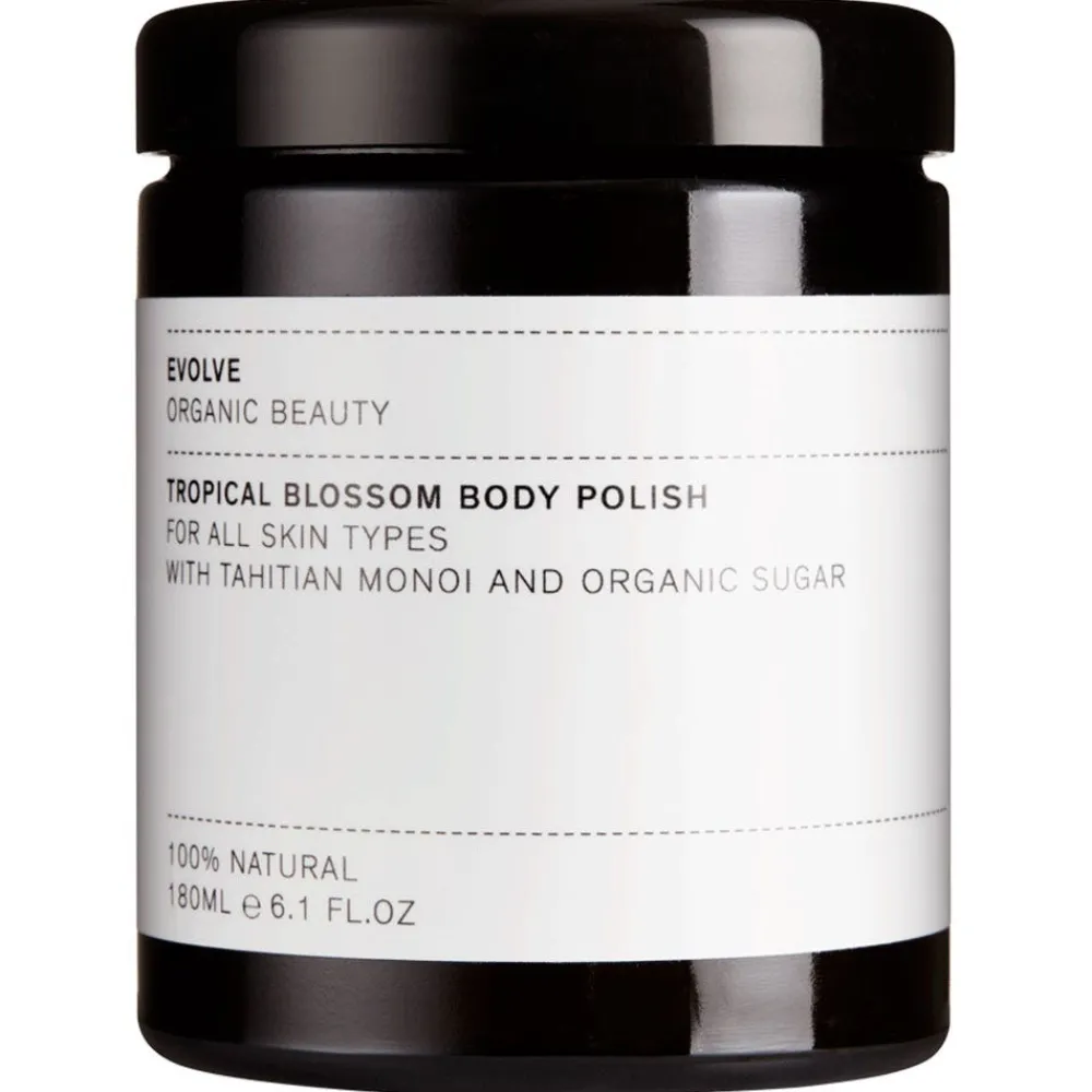 Das Evolve Tropical Blossom Body Polish ist ein sanftes Körperpeeling auf Ölbasis für geschmeidig zarte Haut. Die Formulierung mit feinen Zucker-Partikeln verwandelt sich bei Zugabe von Wasser in eine cremige Emulsion, die sich leicht abwaschen lässt und die Haut weich und geschmeidig hinterlässt. Das Peeling enthält tahitianisches Kokos-Monoi aus exotischen Gardenienblüten und ist mit einem zarten Hibiskus-Duft angereichert. Mandelöl beruhig die Haut udn nährt sie.