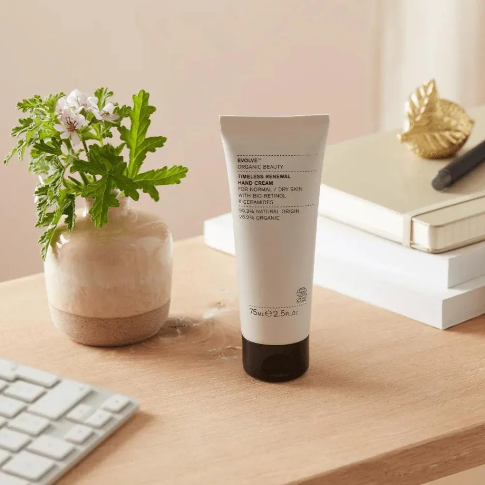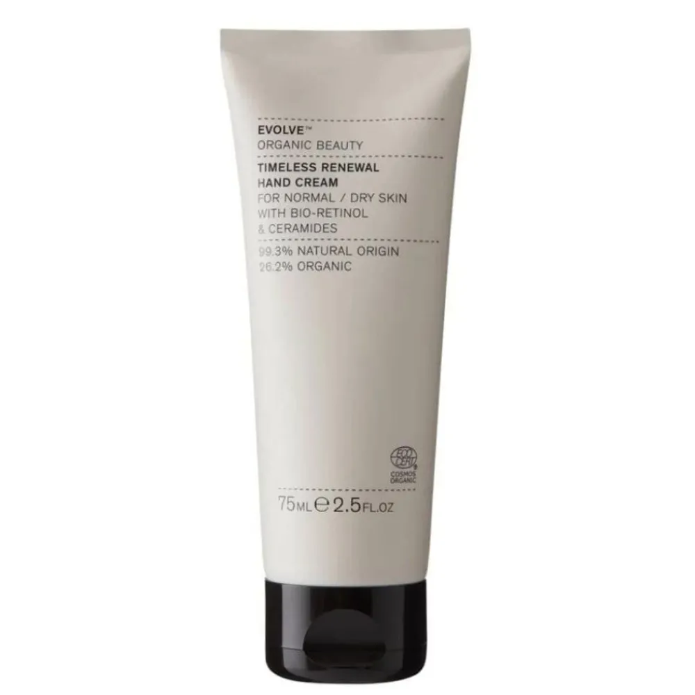 Die Evolve Timeless Renewal Hand Creme mit Bio-Retinol hat eine leichte Textur, aber intensive Wirkung. Wirkt gegen Falten, Hyperpigmentierung und mehr.