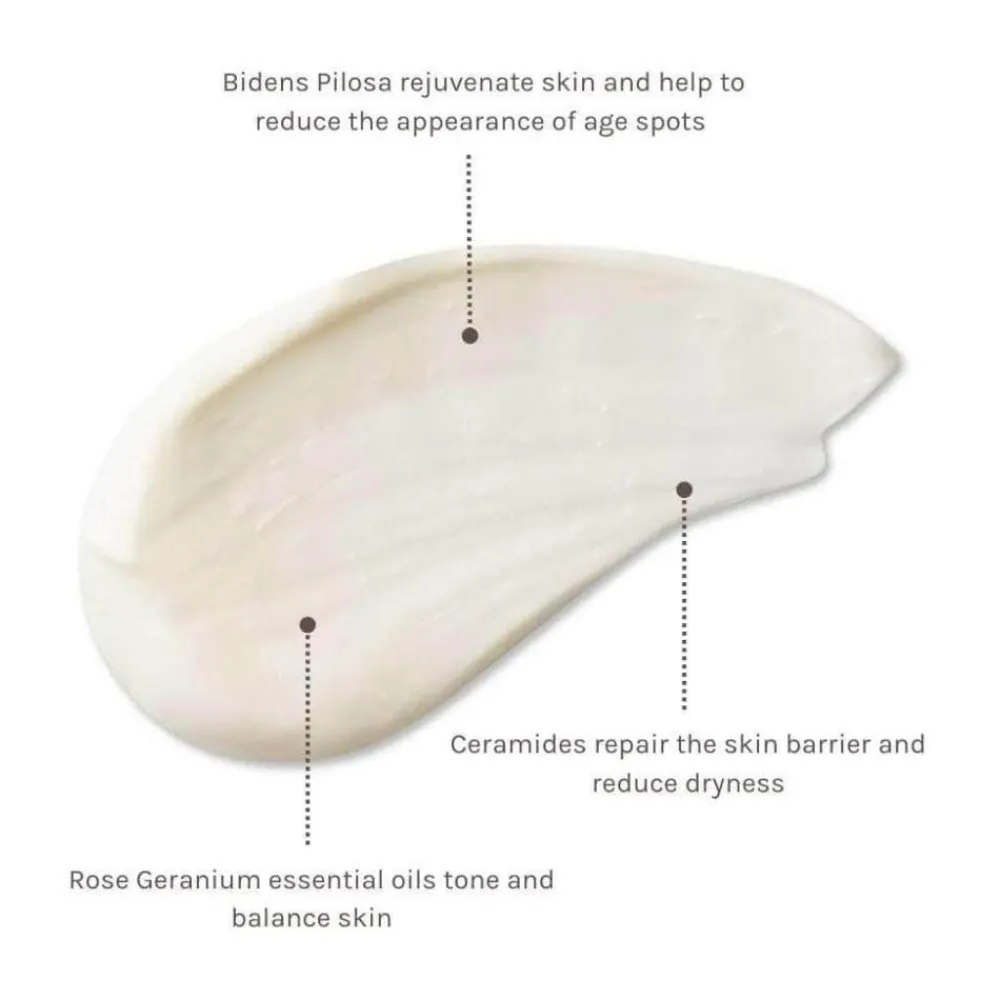 Die Handcreme repariert den schützenden Fettsäuremantel der Haut, sodass sie wieder mehr Feuchtigkeit speichern kann. Reduziert feine Linien und Pigmentflecken. Eine belebende Mischung aus Rosengeranie, Ylang Ylang, Mandarine und Vanille, um die Sinne auszugleichen und zu beruhigen, während ätherische Öle aus Rosengeranie und Mandarine dabei helfen, die Haut zu straffen, zu stärken und zu revitalisieren. Ceramide reparieren die Hautbarriere und machen die Haut weich. Der Extrakt aus Bodens Pilosa hat eine Retinol-ähnliche Wirkung und hinterlässt die Haut glatter, ebenmäßiger und sieht frischer und „jünger“ aus. Falten und Pigmentierung werden sichtbar verbessert.