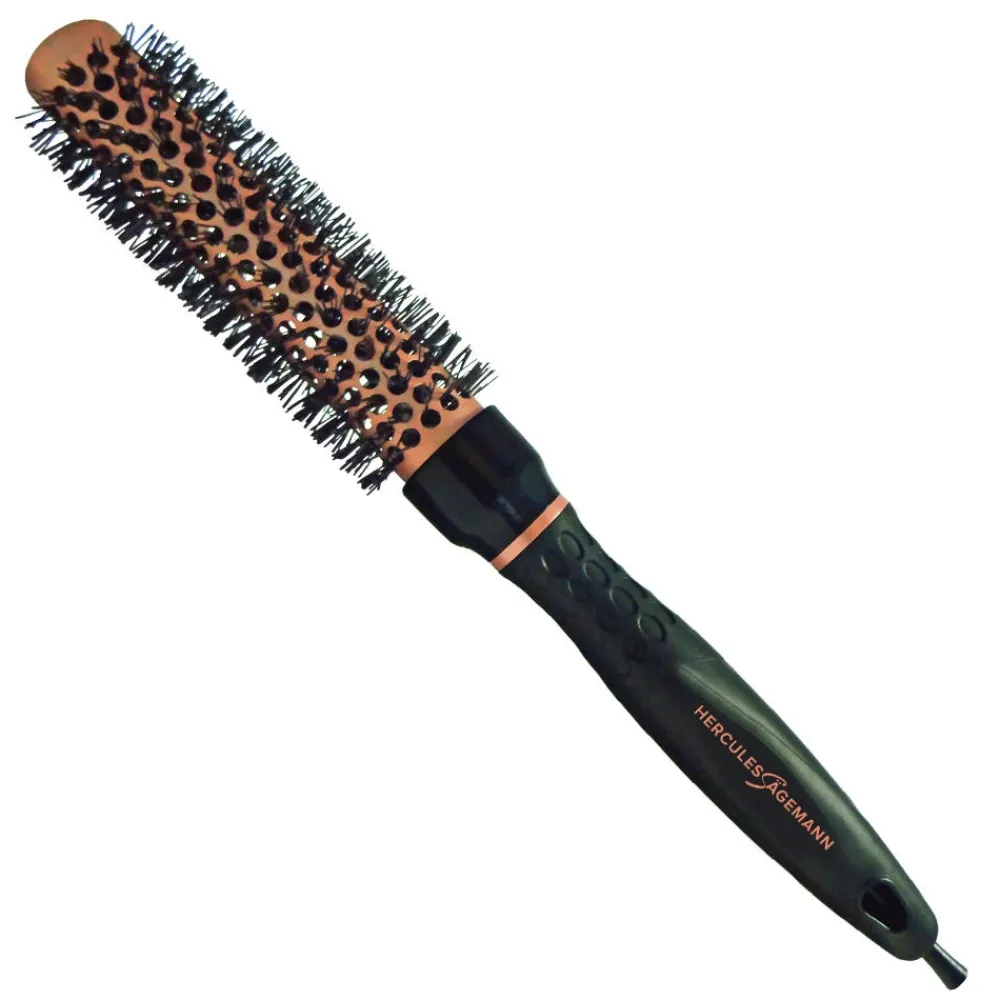 Die Hercules Sägemann Copper Collection Rundbürste hat extrem hitzebeständige Stifte (bis 220°C) und einen extra langen Körper für effizientes Arbeiten. Die hochwertige Kupfer-Keramikbeschichtung sorgt durch ihre niedrige Wärmekapazität für eine schnelle und gleichmäßige Wärmeverteilung. Der Bürstenkörper ist antibakteriell und der gummierte Griff sorgt für eine sichere und angenehme Handhabung. Der abnehmbare Abteilstift ermöglicht kinderleichtes Abteilen von Passees.
