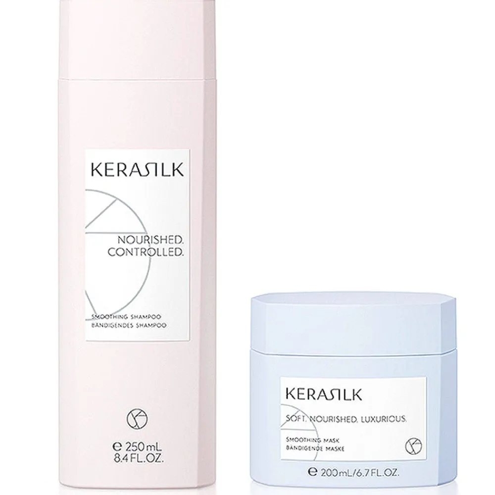 Das Kerasilk Bändigungs Set ist ein 2-teiliges Haarpflegeset, das krauses und wiederspenstiges Haar bändigt und glättet. Das Set ist zusammengesetzt aus einem glättendem Shampoo und einer intensiv pflegenden Haarmaske.