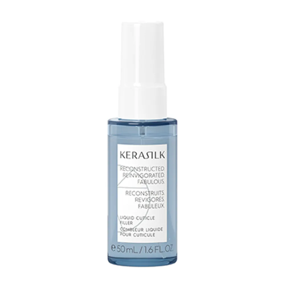 Das Kerasilk Liquid Cuticle Filler ist ein hitzeaktiviertes Spray mit Biomimetic SIlk und Blauer-Lotus- Extrakt. Die zu 100 % vegane Formulierung baut die Haaroberfläche wieder auf und optimiert sie – für eine langanhaltende Regeneration der Schuppenschicht und gesund aussehendes, natürlich glänzendes Haar.