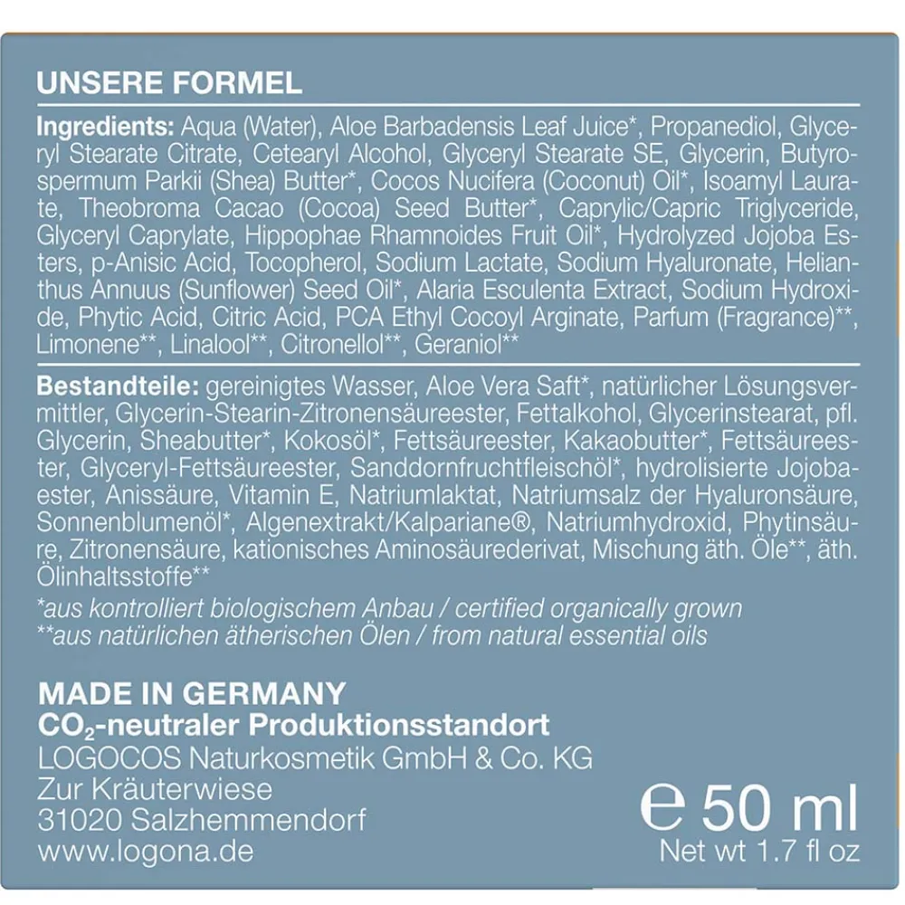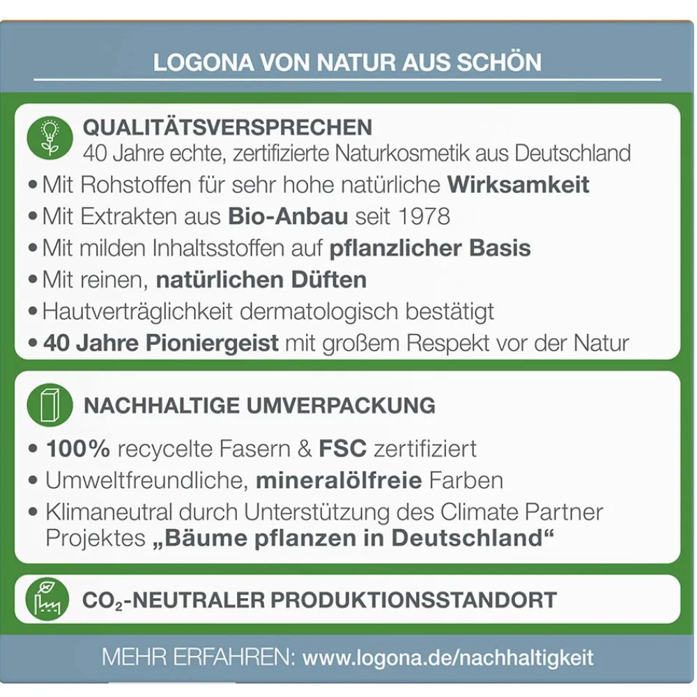 LOGONA vertraut seit 40 Jahren auf die sanfte und wirkungsvolle Kraft der Pflanze. Die Achtung vor der Natur, die Liebe zum Leben und unsere soziale Verantwortung drückt sich in dem Komplettsortiment aus. Das Komplettsortiment ist streng kontrollierte und zertifizierte Naturkosmetik und enstand durch stetige Forschung, Entwicklung und Verbesserung. Die Produkte sind mit Extrakten aus Bio-Anbau angereichert, selbstverständlich Tierversuchsfrei und es findet sich der ganze Reichtum der Natur wieder.