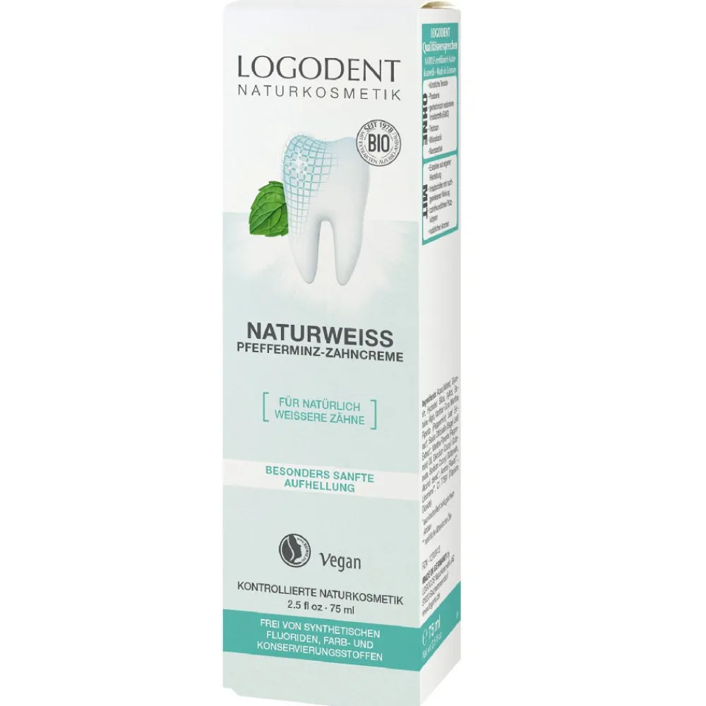 Die LOGODENT Naturweiss Pfefferminz-Zahncreme bietet extra schonende Reinigung und eine sanfte Aufhellung der Zähne. Durch Ablagerungen an der Zahnoberfläche können häufig Verfärbungen entstehen. Plaque und Zahnstein können die Verfärbung, die unter anderem durch Tabak-, Kaffee, Tee und Rotweingenuß hervorgerufen werden, begünstigen. Die hocheffektiven Kieselsäure-Putzkörper der Naturweiß Zahncreme entfernen Plaque und Zahnfärbungen behutsam ohne den Zahnschmelz anzugreifen. Sie sorgen für eine sanfte Aufhellung nach und nach und helfen so das natürliche Weiß der Zähne zu erhalten. Ein frisches Pfefferminzaroma sorgt für anhaltende Frische. Frei von synthetischen Fluoridzusätzen.