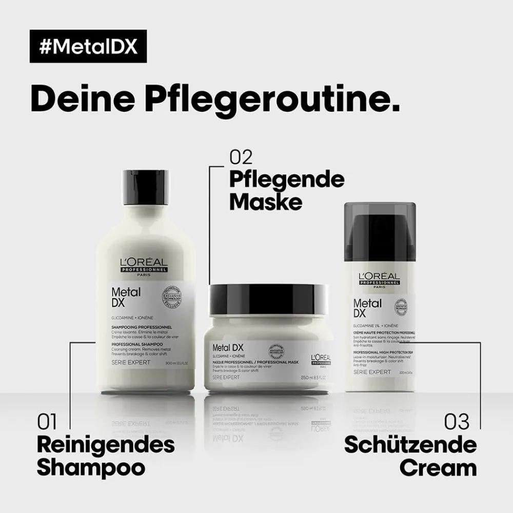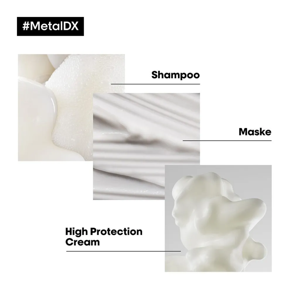 Die L’Oréal Professionnel Paris Serie Expert Metal DX High Protection Cream wurde für alle Haartypen entwickelt. Sie ist die perfekte Ergänzung der Metal DX Routine. Angereichert mit Glicoamin zieht die zartschmelzende, feuchtigkeitsspendende Textur sofort ein und umhüllt die Haarfaser, ohne das Haar zu beschweren. Die Cream sorgt für langanhaltende Frizz-Kontrolle, macht das Haar weicher, geschmeidiger und leichter stylbar (nach Anwendung der Metal DX Routine). Das Haar ist glänzender und die Farbe hält länger. 97% der Farbbrillanz bleiben nach 8 Wochen erhalten. Mit UV-Filter: schützt das Haar vor UV-induzierten Schäden und Oxidation, Bürsten und Hitze bis 230°C.