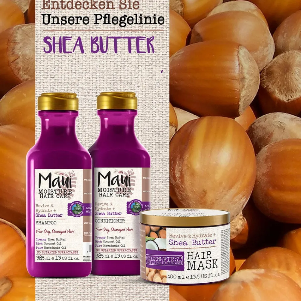 Die Maui Moisture Revive & Hydrate Shea Butter Mask ist ein Traum für jeden mit trockenem, geschädigtem oder überstyltem Haar. Diese Haarmaske spendet intentive Feuchtigkeit und speichert sie im Haar. Die Formel mit Shea-Butter, Kokosnuss-Öl und Macadamia-Öl macht geschmeidig, hydratisiert und revitalisiert. Bei besonders trockenem Haar kann diese tiefenwirksame Pflege ohne Ausspülen auf dem nassen Haar verbleiben.