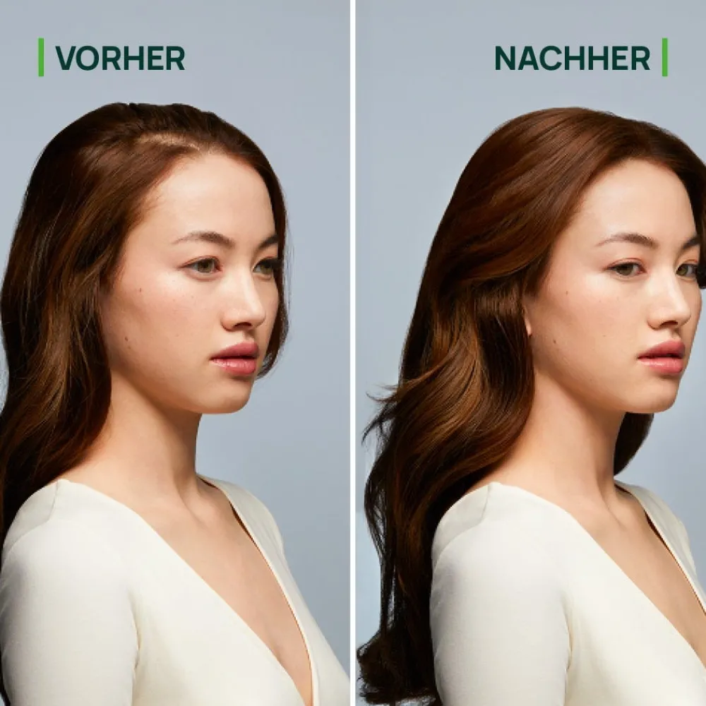 Die natürliche Formulierung ist mit 98% natürlichen, hochwirksamen Aktivstoffen gegen Haarausfall angereichert, insbesondere mit Biotrinine, einem Aktivstoff, der in den entscheidenden Phasen des Haarzyklus wirkt. Mit drei aktiven Phasen wirkt diese Formulierung effektiv und umfassend gegen Haarausfall: Sie verlangsamt den Haarausfall, bewahrt das Haarkapital und stärkt das Haar sichtbar.