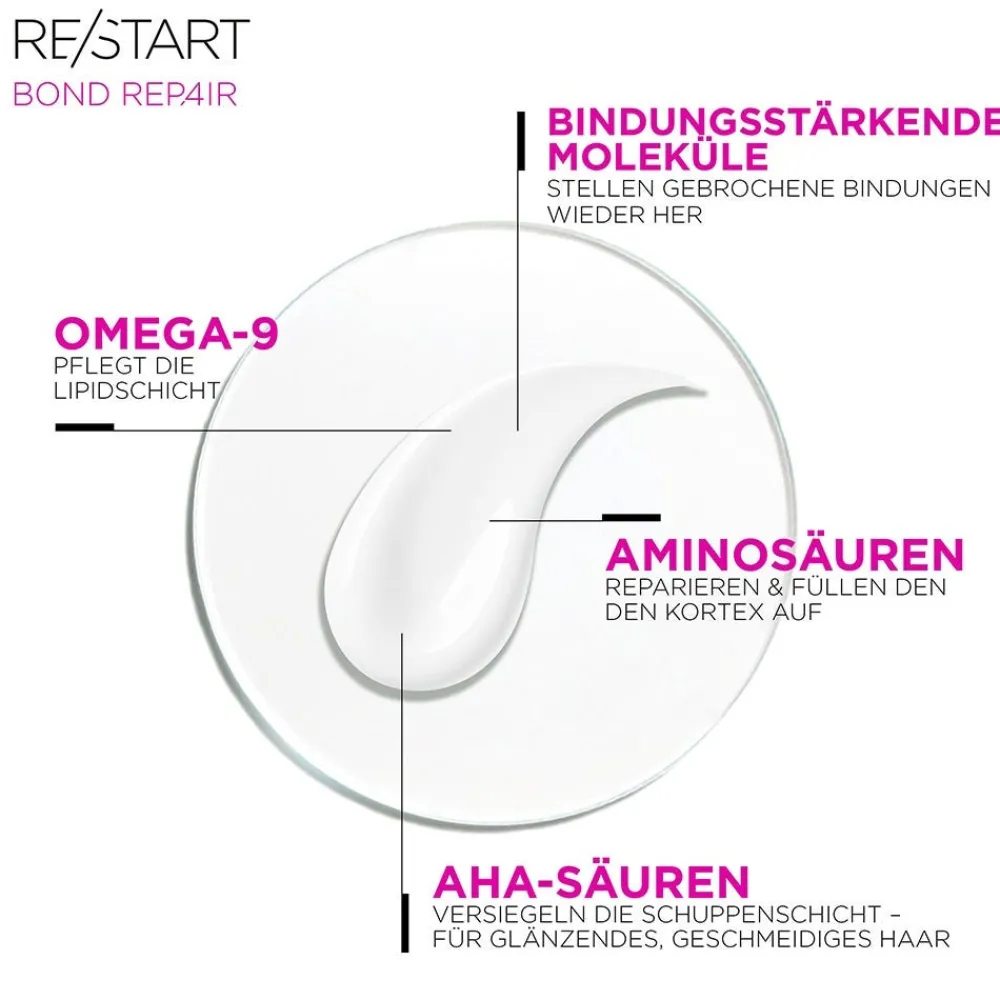 Die Formulierung ist für jeden Grad von Haarschädigung ideal, zu 100 % vegan und silikonfrei. Das Treatment ist eine von fünf gezielten Lösungen aus der RE/START BOND REPAIR-Serie – einer kompletten, wissenschaftlich fundierten Pflegeserie, die über herkömmliche Repair-Produkte hinausgeht. Von der Hautpflege inspiriert, umfasst die Serie mit exklusiver LipidBond Filler-Technologie fünf hochwirksame Produkte: ein sanftes Shampoo, einen zart-schmelzenden Conditioner, eine Intensiv-Maske, Shine Repairing Drops sowie dieses Pre-Wash- und Leave-in-Treatment.