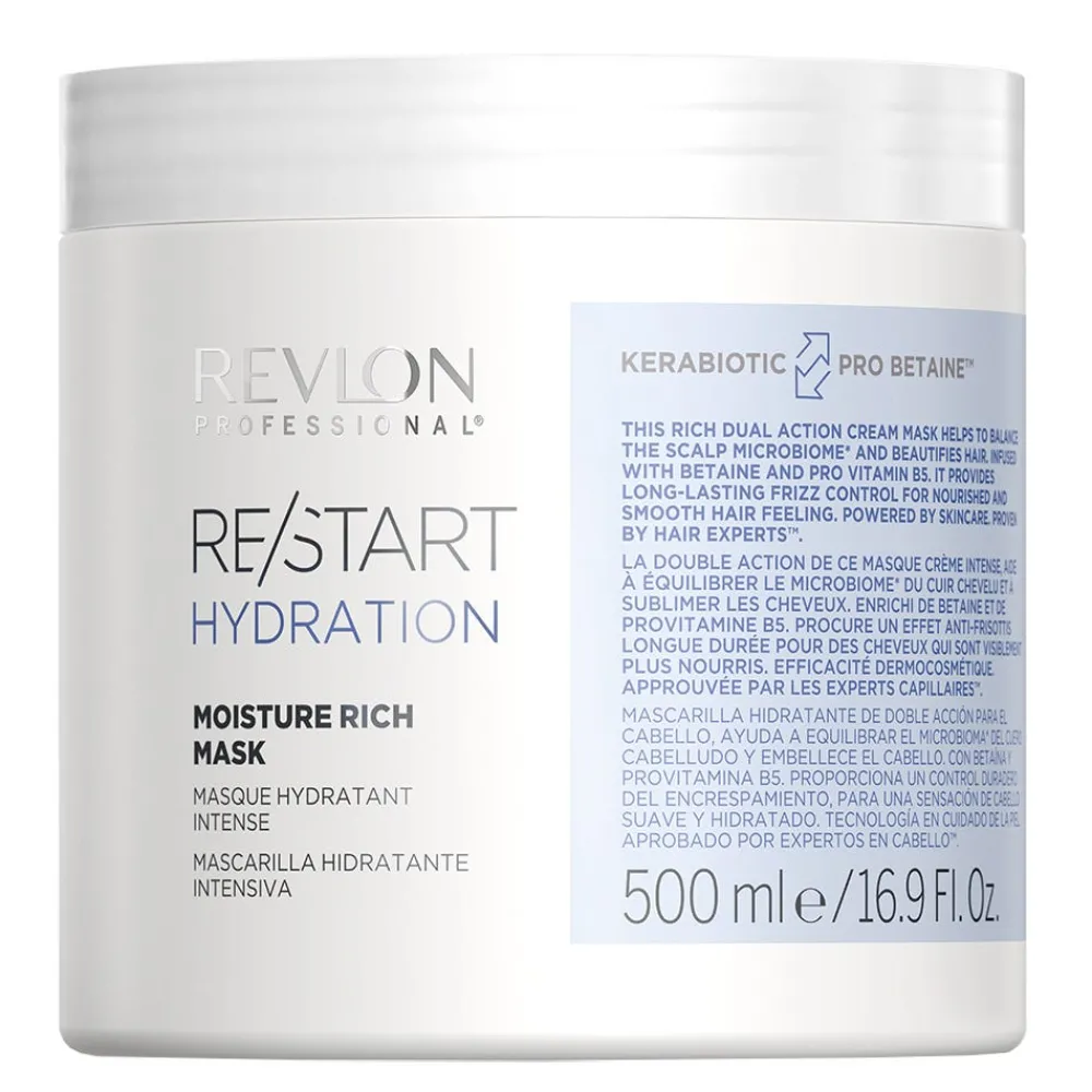 Die Revlon Re/Start Moisture Rich Mask hilft, das Mikrobiom der Kopfhaut auszugleichen* und verschönert das Haar. Infundiert mit Betain und Pro-Vitamin B5. Es bietet eine lang anhaltende Kontrolle der Haarkräuselung für glattes und gepflegtes Haar.