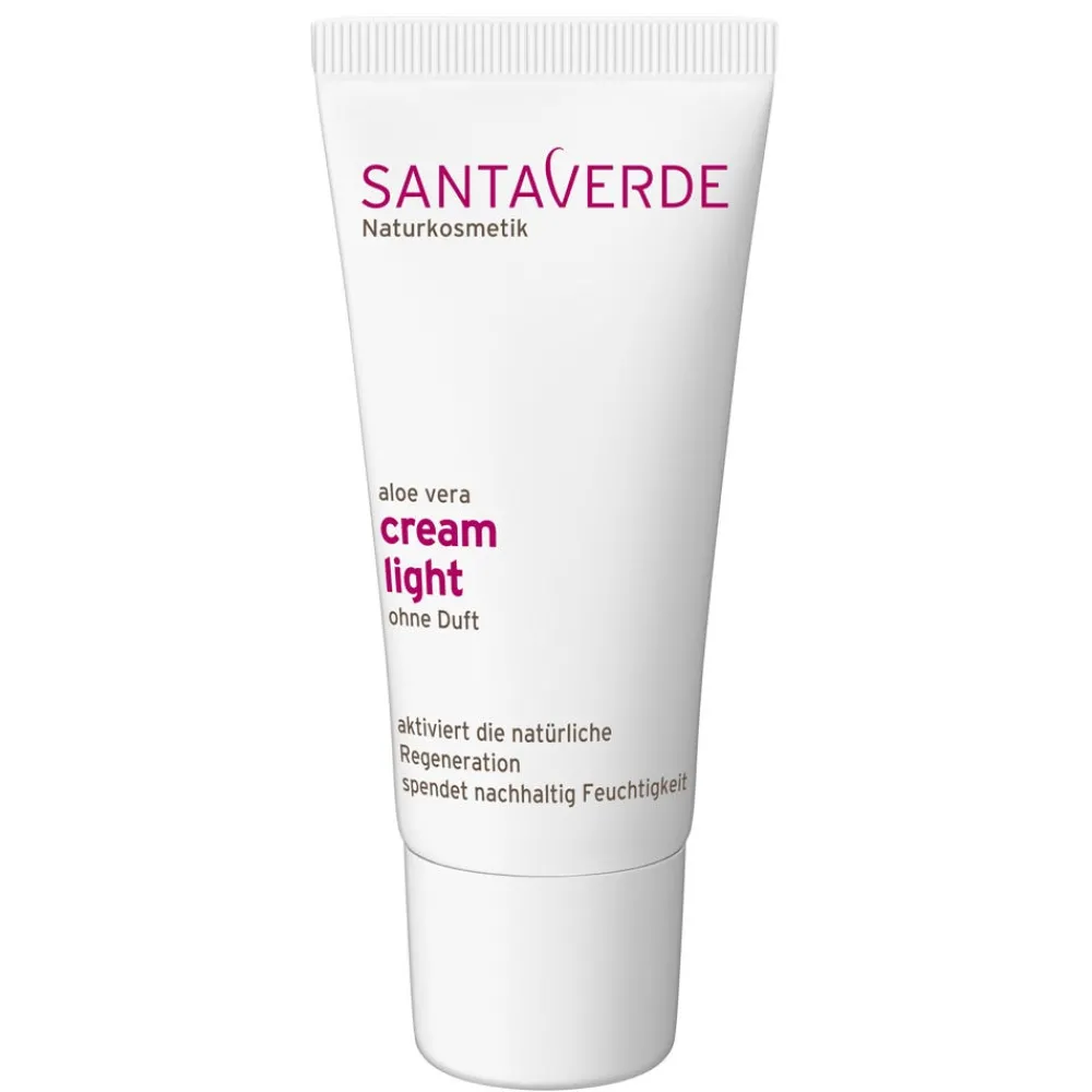 Die Santaverde Cream Light ohne Duft aktiviert die natürliche Regeneration der Haut und bewahrt ihre Geschmeidigkeit. Reiner Aloe Vera Saft spendet in Verbindung mit Hyaluron nachhaltig Feuchtigkeit. Apfelextrakt wirkt zellschützend und schützt so die Hautelastizität. Squalan und Mandelöl beruhigen die Haut mit Pflegestoffen. Die Santaverde Cream Light ohne Duft wird schnell von der Haut aufgenommen. Geeignet für normale Haut und Mischhaut. Die Creme ist außerdem frei von ätherischen Ölen.
