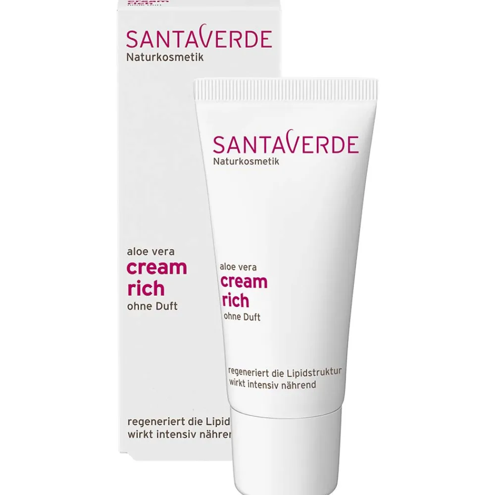 Die Santaverde Cream Rich ohne Duft ist eine reichhaltige Gesichtscreme mit aufbauenden Pflegestoffen zur Regeneration der Haut. Die Creme ist frei von ätherischen Ölen. Reine Aloe Vera Saft und antioxidatives Vitamin E optimieren die Feuchtigkeitsanreicherung. Sheabutter und Arganöl spenden reichhaltige Wirkstoffe, die intensiv nähren und stärken. Zusätzlich beruhigt Nachtkerzenöl die Haut und wirkt rötungslindernd. Für genährte und geschützte Haut. Die Creme eignet sich ideal für trockene Haut.