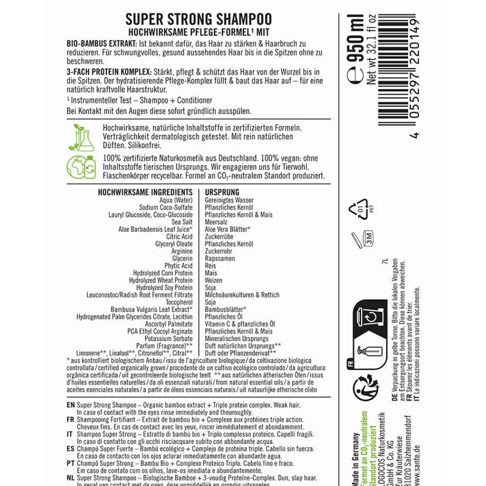 Das SANTE Super Strong Shampoo enthält eine hochwirksame Pflegeformel¹ aus Bio-Bambus Extrakt und 3-Fach Protein Komplex, die das Haar kräftigt und Haarbruch reduziert. Für schwungvolles, gesund aussehendes Haar bis in die Spitzen ohne zu beschweren ohne zu beschweren. Der 3- Fach Protein Komplex stärkt, pflegt & schützt das Haar von der Wurzel bis in die Spitzen. Der hydratisierende Pflege-Komplex füllt & baut das Haar auf, für eine natürlich kraftvolle Haarstruktur. Die Verträglichkeit ist dermatologisch getestet.