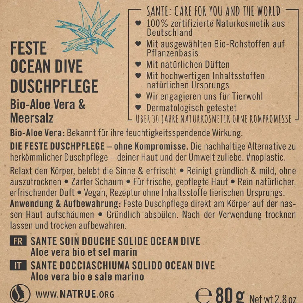 Innovative Duschpflege SANTE Feste Duschpflege Ocean Dive ohne Kompromisse. Relaxt den Körper & belebt die Sinne. Reinigt sanft und gründlich, ohne auszutrocknen. Für frische & gepflegte Haut. Mit milden, natürlichen Tensiden. Sanfter Schaum. Rein natürlicher, frischer Duft. Mit Bio-Aloe Vera: Bekannt für ihre beruhigende und feuchtigkeitsspendende Wirkung.