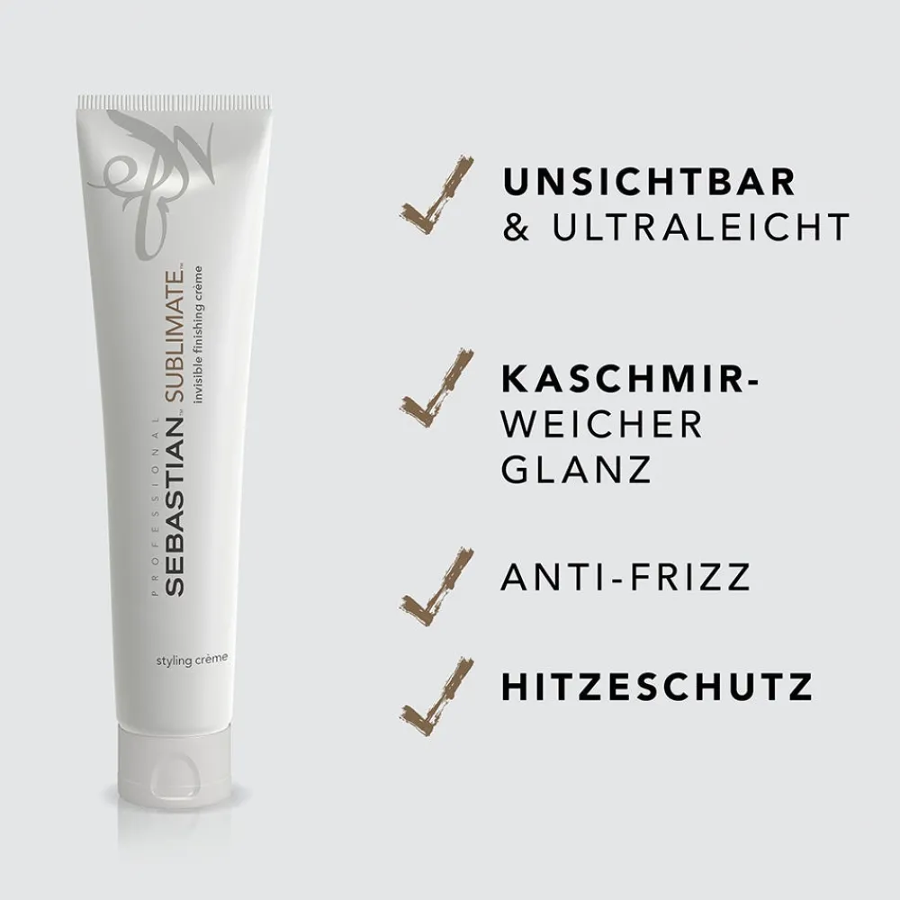 Die Sebastian Sublimate Crème kreiert einen natürlichen Glanz. Die universelle Finishing-Creme ist für jeden Haartyp geeignet. In Sublimate ist ein flexibles Polymer, welches einen weichen Film um jede Haarfaser legt. Damit entsteht ein größerer Anti-Frizz-Effekt und ein natürlicher Glanz. Dank der ultraleichten Textur kann der Look jederzeit wiederbelebt werden. Bei der Sebastian Professional Sublimate Creme trifft Pflege auf Styling. Die Haare bekommen einen seidenweichen Glanz, fliegende Haare werden gebändigt und definiert.