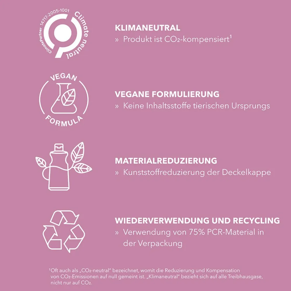 | Besonderheit | Biologisch, Dermatologisch getestet, Frei von Mineralöl, Keine tierischen Inhaltsstoffe, Silikonfrei, Sulfatfrei, Umweltfreundlich, Vegan |