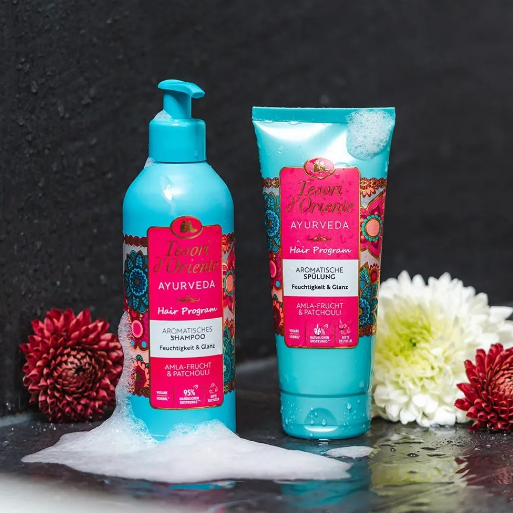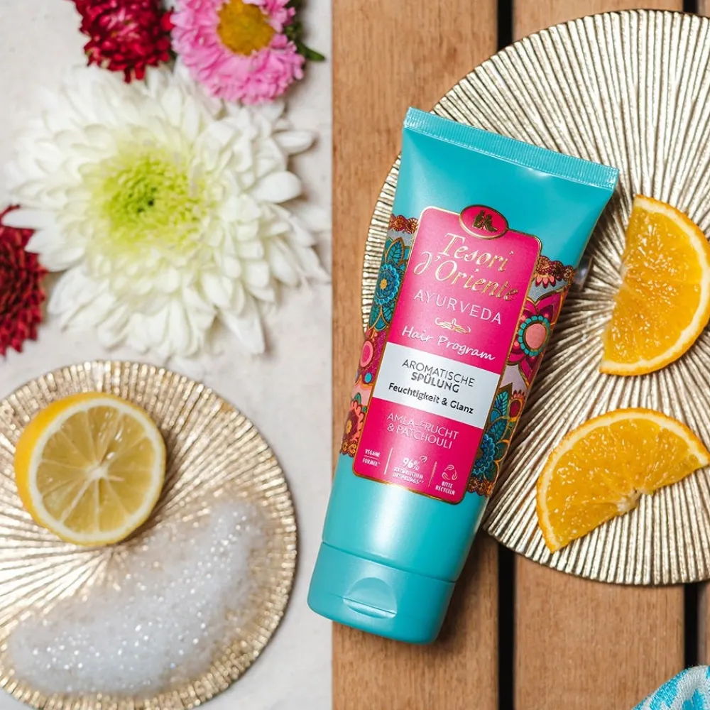 Entfliehe dem Alltag und begib dich auf eine Reise in die zauberhafte Welt des Orients! Verwandle dein Badezimmer in eine Oase des Wohlbefindens und gönne deinem Haar eine Extraportion Pflege mit der Tesori d‘ Oriente aromatische Spülung Ayurveda. Inspiriert von der indischen Lebensphilosophie, fördert er dein inneres Gleichgewicht und schenkt deinem Haar die Pflege, die es verdient. Angereichert mit den natürlichen Schätzen Amla-Fruchtextrakt, Sesam-Öl, Aloe vera und Calendula, spendet diese Spülung deinem Haar intensive Feuchtigkeit, verleiht ihm strahlenden Glanz und macht es leichter kämmbar und geschmeidiger. Der harmonische Duft von süßer Orange, Zitrone, Patchouli und Zedernholz sorgt für ein sinnliches Pflegeerlebnis, das die Sinne verwöhnt und dich gedanklich in den Orient entführt.