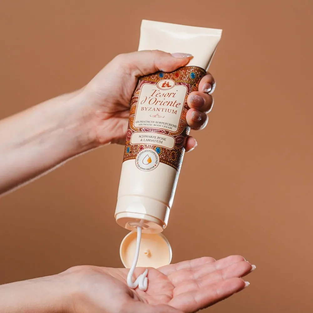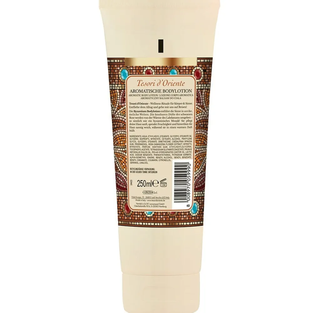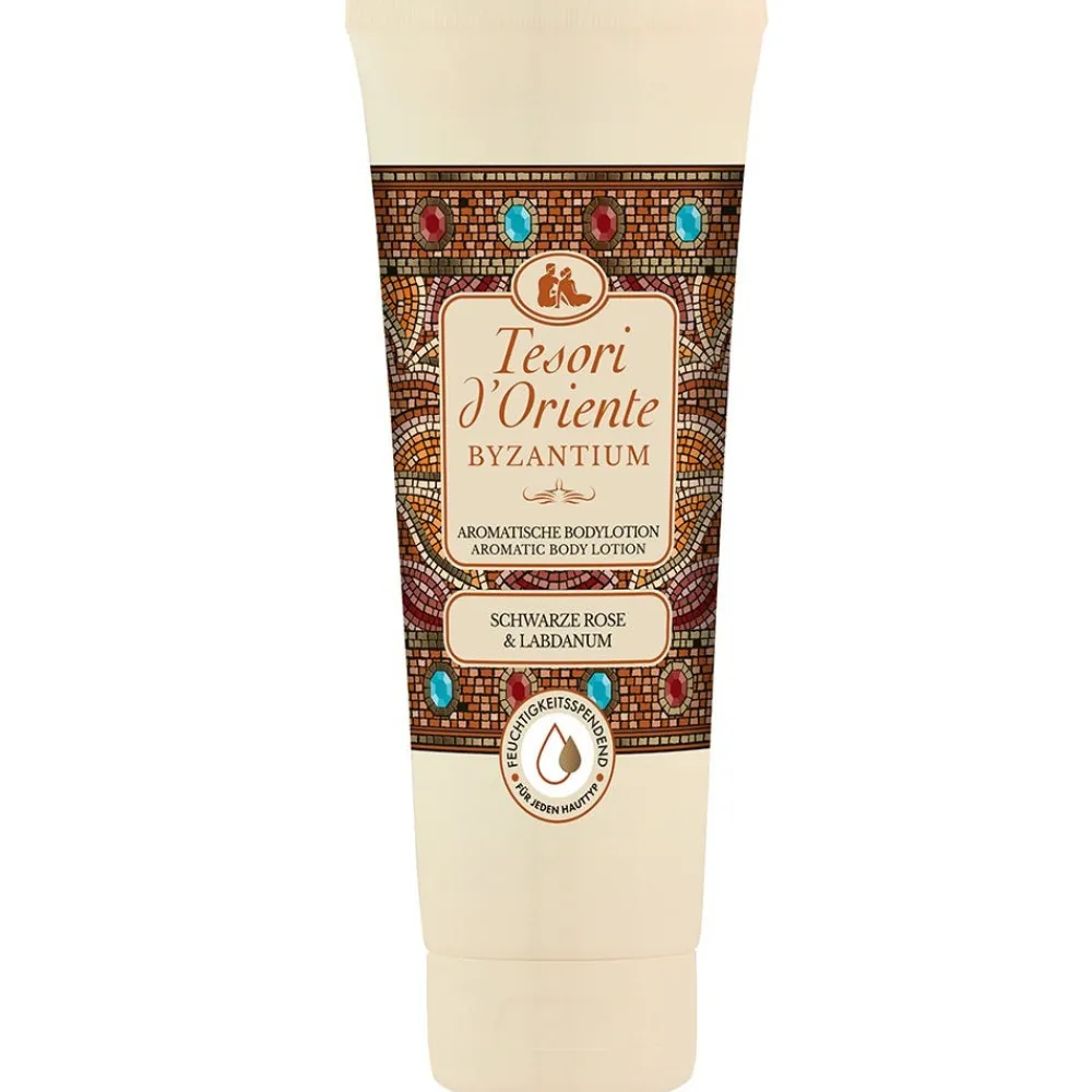 Entfliehe dem Alltag und begib dich auf eine Reise in die zauberhafte Welt des Orients! Die aromatische Tesori d‘ Oriente Body Lotion Byzantium entführt die Sinne in die antike Stadt Byzanz, dessen majestätische, goldene Paläste, von himmlischen Düften, seltener Blumen und kostbarer Harze durchdrungen wurden. Die Kombination aus schwarzer Rose und Labdanum sorgt für ein sinnliches Pflegeerlebnis und verleiht der Haut dabei ein Gefühl der Weichheit und Geschmeidigkeit. Mit seiner edlen Optik und dem traumhaften Duft ist die Bodylotion zudem nicht nur ein Highlight im eigenen Zuhause, sondern auch eine schöne Geschenkidee, um die Liebsten gedanklich in den Orient verreisen zu lassen.