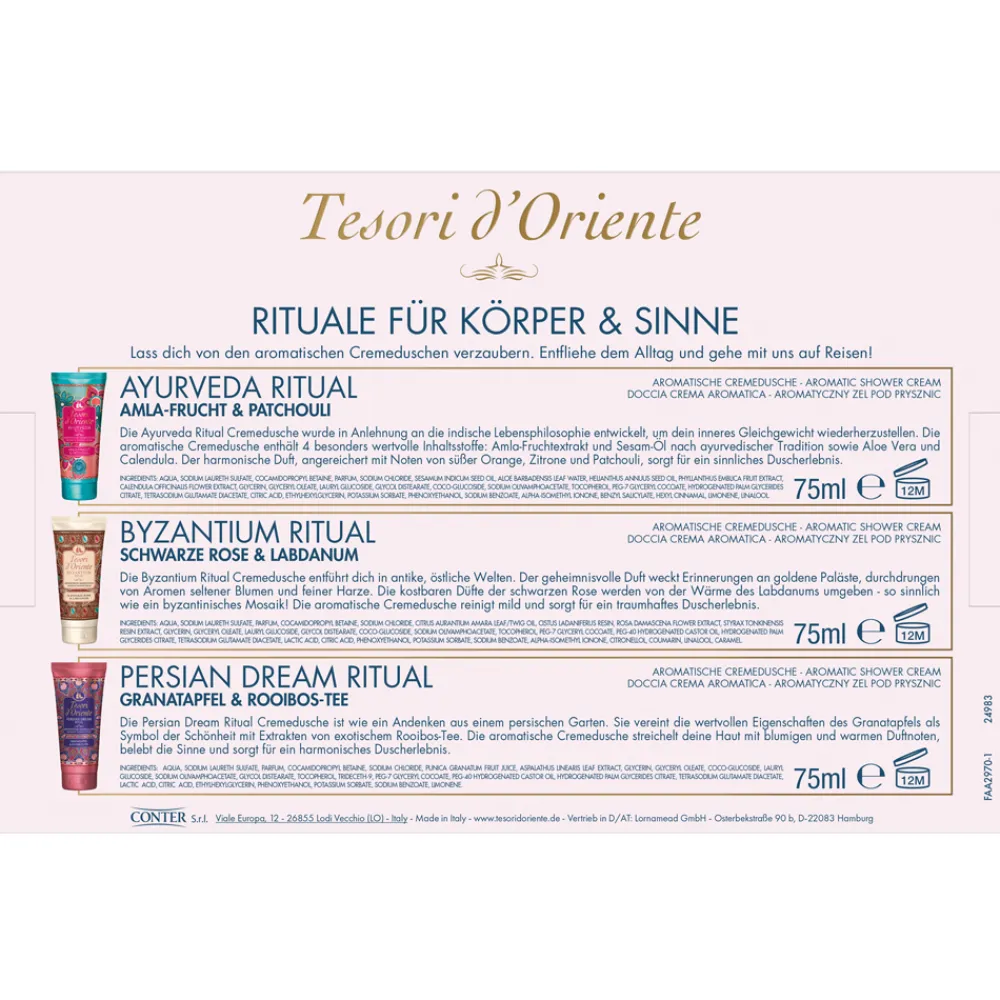 Das edle Tesori d´ Oriente Cremeduschen Geschenkset vereint die beliebten Produkte dreier Wellness-Rituale in Einem. Die Duschgele sind in praktischen Mini-Größen von je 75 ml verpackt und eignen sich perfekt für unterwegs oder als Geschenkidee. Das Set ist auch ideal zum Ausprobieren der verschiedenen Düfte und für diejenigen, die sich nicht auf einen Duft festlegen möchten. Das Set enthält 1x Tesori d´ Oriente Ayurveda Wellness-Ritual 75 ml, 1x Tesori d´ Oriente Byzantium Wellness-Ritual 75 ml und 1x Tesori d´ Oriente Persian Dream Wellness-Ritual 75 ml.