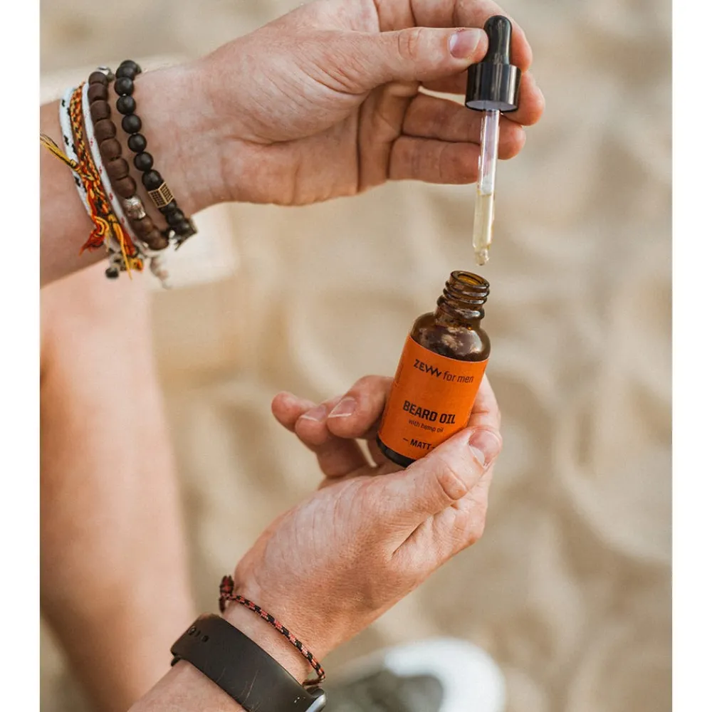 Das regenerierende ZEW for Men Beard Oil with Hemp Oil matt mit Hanföl und dem Duft von Sandelholz und Moschus ist der täglichen Pflege und dem Styling des Bartes gewidmet. Es wirkt matt, nährt und stimuliert das Haarwachstum. Es enthält Hanföl, Arganöl und Schwarzkümmelöl, die den Bart sichtbar stärken und ihn leicht bürsten, glänzen und weich machen. Eine hohe Konzentration an Avocadoöl sorgt für die richtige Feuchtigkeit. Das Bartöl normalisiert die Haut. Aufgrund der komplexen Wirkung von Hanföl wird ZEW for Men Beard Oil with Hemp Oil matt besonders für Menschen mit trockener und reifer Haut empfohlen. Dank seiner hervorragenden nahrhaften und regenerierenden Eigenschaften eignet sich das Öl auch perfekt für Menschen mit fettiger und zu Akne neigender Haut. Es hinterlässt keinen Ölfilm und reguliert die Funktion der Talgdrüsen. Hanföl ist eine reichhaltige Quelle an Vitaminen, Mineralien, Proteinen, Antioxidantien und Aminosäuren. Es enthält auch Wirkstoffe mit antiseptischen, antioxidativen und sonnenschützenden Eigenschaften. Fettsäuren im Öl machen die Haut geschmeidig und glatt. Es ist auch für Allergiker geeignet.