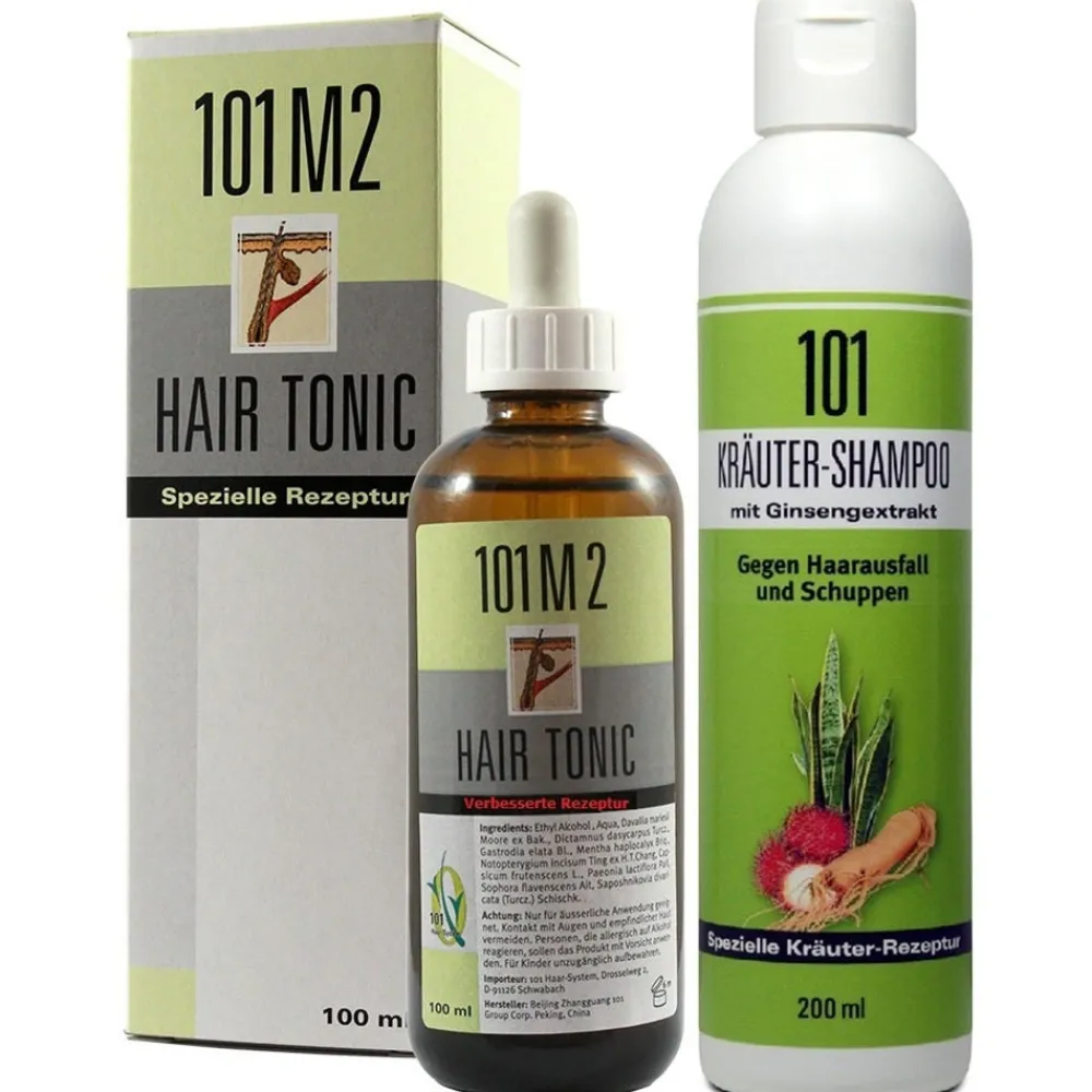 101 101M2 Hair Tonic + Ginseng Shampoo Bundle – Aktivierendes Haarpflege-Set mit Tonic und Kräuter-Shampoo für kräftigeres, dichteres Haar. Das Bundle enthält 1x 101M2 Hair Tonic Haarserum 100 ml und 1x 101 Kräuter-Shampoo 200 ml.