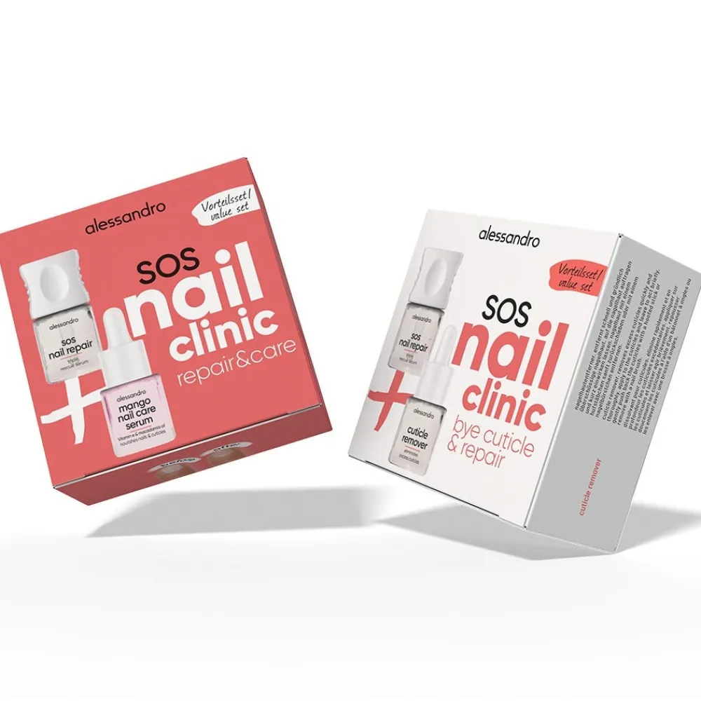 alessandro Nail Clinic Box Repair & Care Set – Ein kraftvolles Set für gesunde, starke und gepflegte Nägel. Das Set enthält 1x alessandro SOS Nail Repair Serum 10 ml und 1x alessandro Mango Nail Care Serum 10 ml.