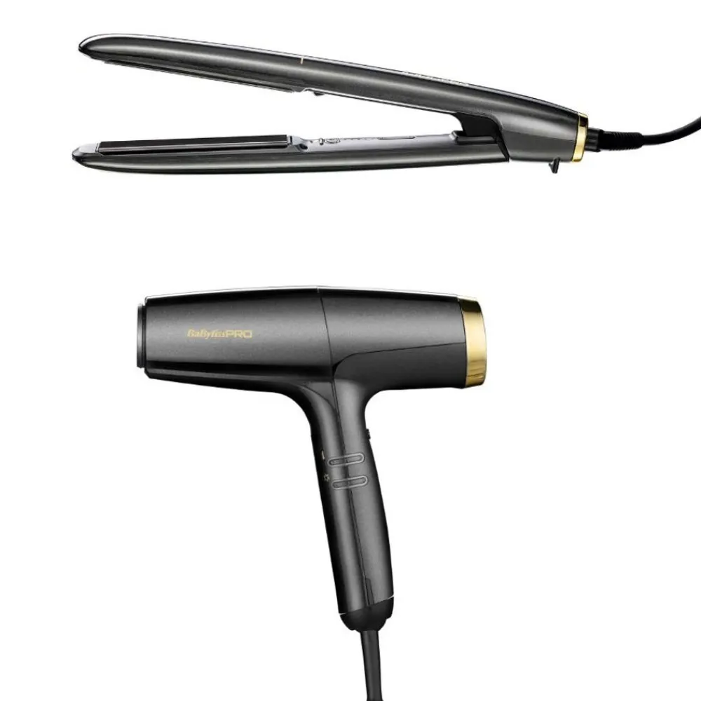 Das BaBylissPRO Falco & Stilista Styler Gold Bundle besteht aus unserem Babyliss Pro FALCO Haartrockner und dem BabylissPRO Black & Silver Italian Straightener.