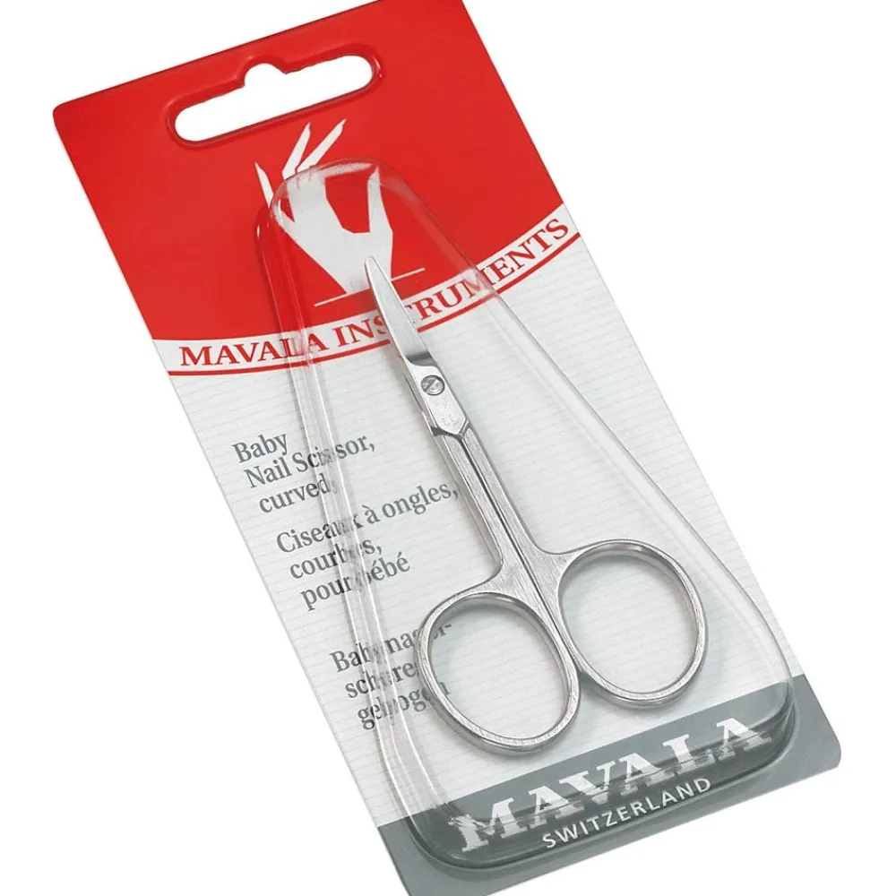 Die Mavala Babynagelschere gebogen mit abgerundeten Spitzen und aus hochwertigem gehärtetem, warm geschmiedetem Stahl, eignet sich ideal zum Schneiden von weichen Babynägeln.