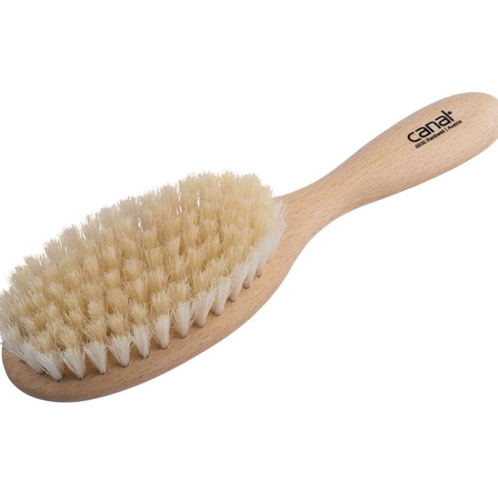 Die Canal Kinderhaarbürste, 185 mm für feines Kinderhaar und mit mittelfesten Naturborsten für gute Durchblutung ist sehr gut geeignet bei erstem Milchschorf. Sie glättet und reinigt das Haar. Mit Griff aus heimischem, geöltem Buchenholz.