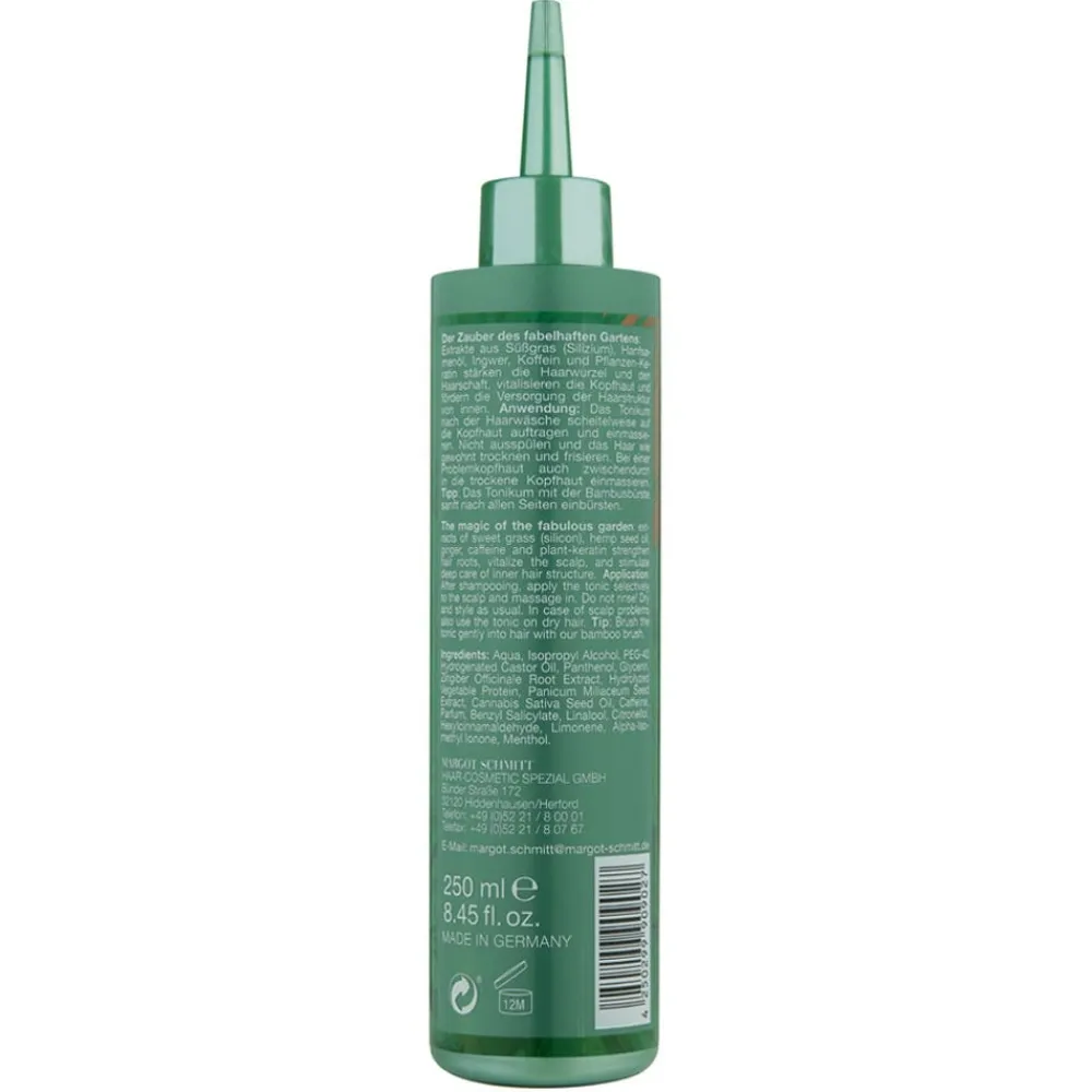 Das Margot Schmitt Fabelhafter Garten Süßgras Tonikum ist zur Stärkung von Haarwurzel und Haarschaft. Der Zauber des fabelhaften Gartens: Extrakte aus Süßgras (Silizium), Hanf, Schwarzer Pfeffer, Ingwer, Koffein, Collagen kombiniert mit Vitamin E, Reisprotein, Kamillenblüten und Panthenol stärken die Haarwurzel und den Haarschaft, vitalisieren die Kopfhaut und fördern die Versorgung der Haarstruktur von innen.
