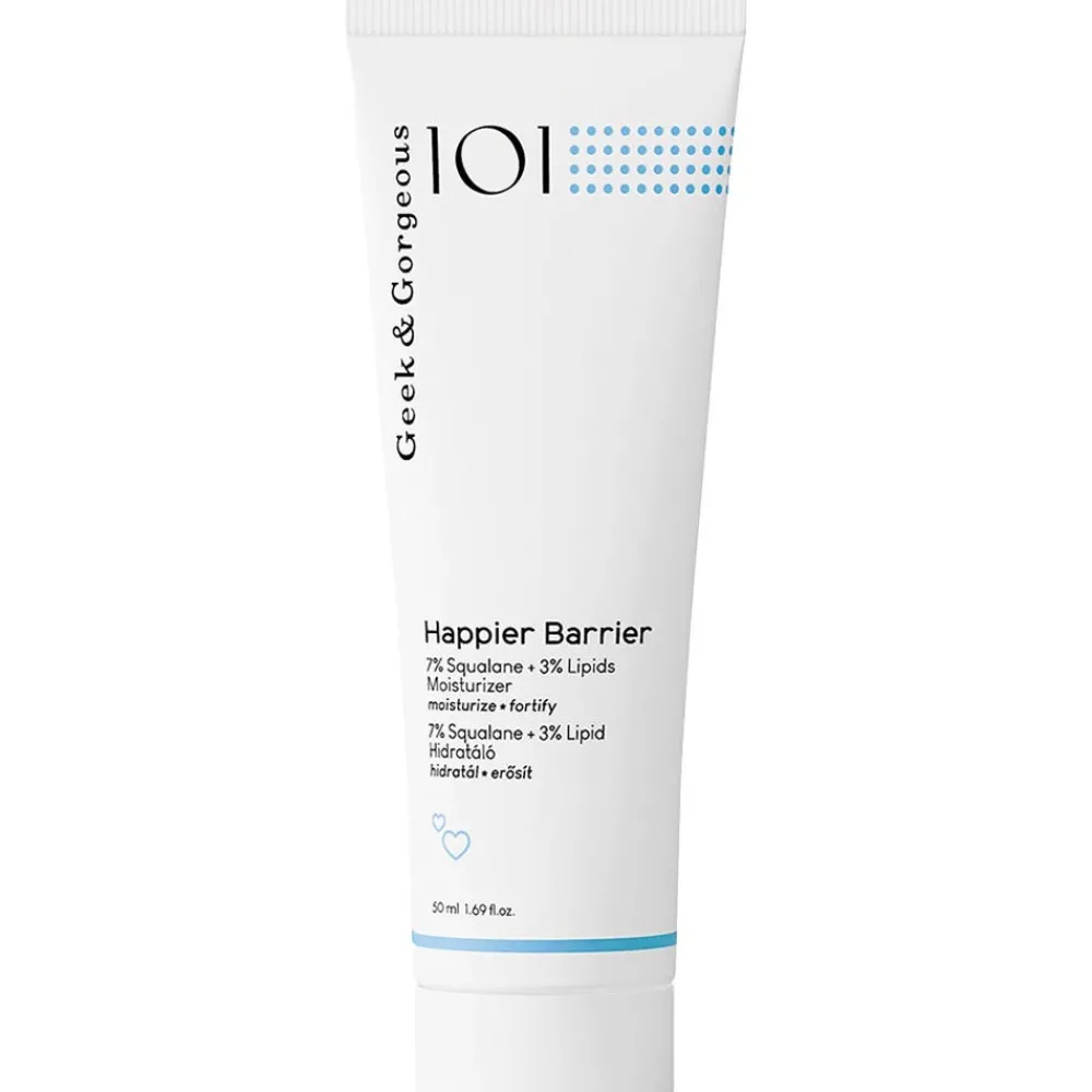 Das Geek & Gorgeous Happier Barrier ist eine intensiv pflegende Feuchtigkeitscreme, die die Hautbarriere stärkt und die Haut geschmeidig weich hinterlässt. Die leichte, cremige Textur ist angereichert mit 7 % Squalan, 3 % hautidentischen Lipiden und 0,1 % Ceramiden, die die Haut tiefenwirksam hydratisieren, schützen und regenerieren. Ein patentierter Lipidkomplex aus Jojoba-, Macadamia- und Olivenöl imitiert die natürlichen Lipide junger Haut. Grüntee-Extrakt liefert wertvolle Antioxidantien, während Allantoin und Bisabolol die Haut beruhigen und Rötungen mildern. Ideal für trockene, normale und Mischhaut.