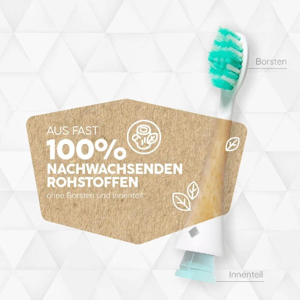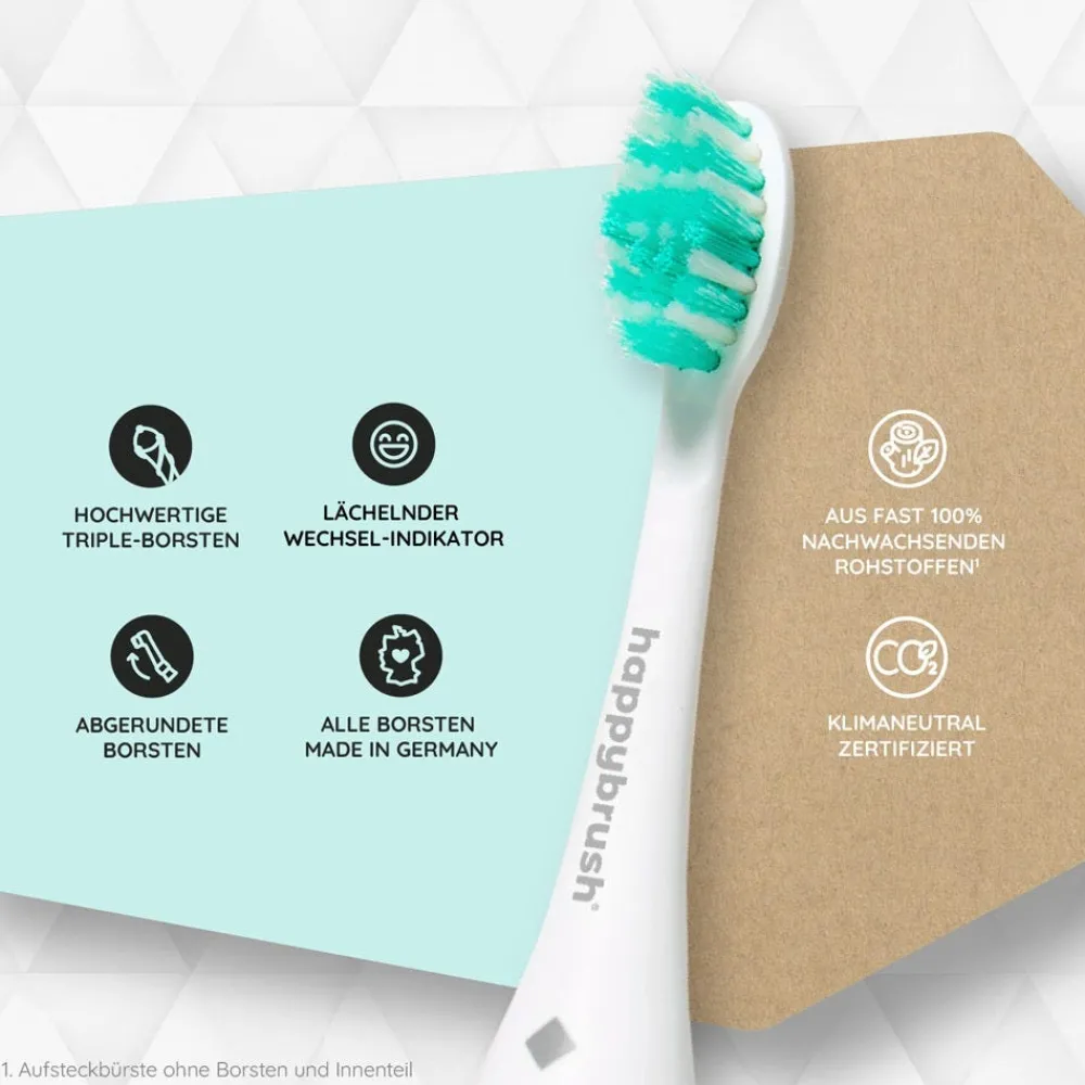 Auf die inneren Werte kommt es an! Mit dem Happybrush Aufsteckbürsten V3+ white aus fast 100% nachwachsenden Rohstoffen* schenkst Du Dir und unserer Umwelt Tag für Tag ein strahlendes Lächeln. Die hochwertigen Borsten verwöhnen Deine Zähne sanft und gründlich – mit effektiven Triple-Borsten und lächelndem Wechselindikator. Zudem sind die Happybrush Aufsteckbürsten V3+ white Made in Germany, klimaneutral und vegan.