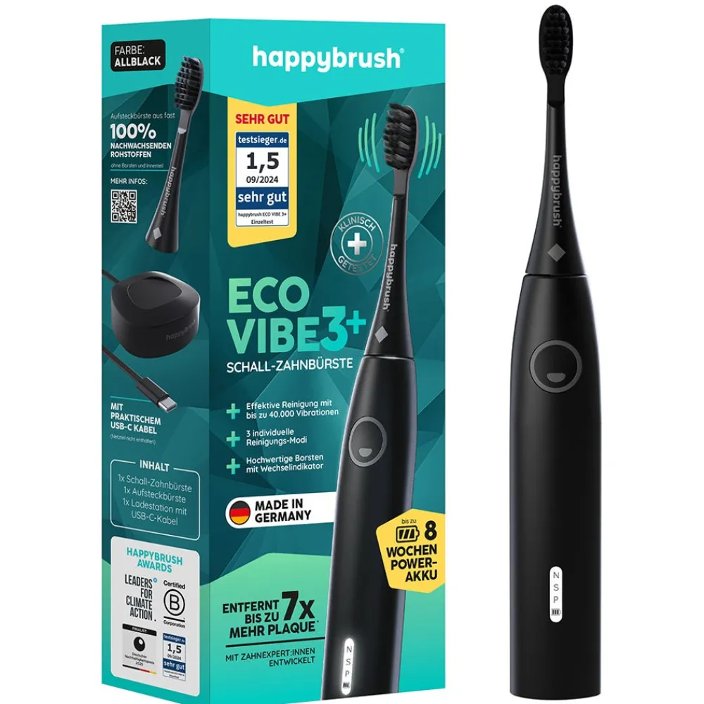 Die Happybrush StarterKit Schall VIBE 3+ AllBlack ist eine leistungsstarke Schallzahnbürste mit einem Gehäuse aus 100% recyceltem Material*. Der leistungsstarker Power-Akku hält bis zu 8 Wochen und ist bereit für jedes Reiseabenteuer. Die Zahnbürste sorgt mit bis zu 40.000 hoch-effektiven Vibrationen, 3 individuellen Reinigungs-Modi und hochwertigen Triple-Borsten für eine gründliche, sanfte Reinigung. Im Lieferumfang enthalten sind ein Handgriff, eine Aufsteckbürste und eine Ladestation.