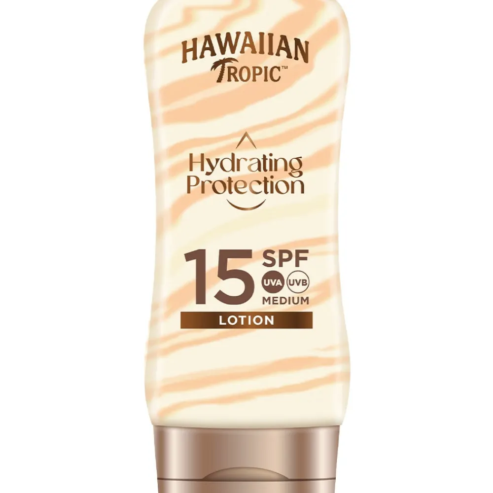 Die Hawaiian Tropic Hydrating Protection Sun Lotion LSF 15 bietet einen umfassenden UVA- und UVB-Schutz, während sie gleichzeitig deine Haut pflegt und mit Feuchtigkeit versorgt. Sie nährt und hydratisiert deine Haut bis zu 12 Stunden. Dabei erfrischt sie die Haut mit einem sinnlich tropischen Duft, ganz ohne öliges Gefühl.