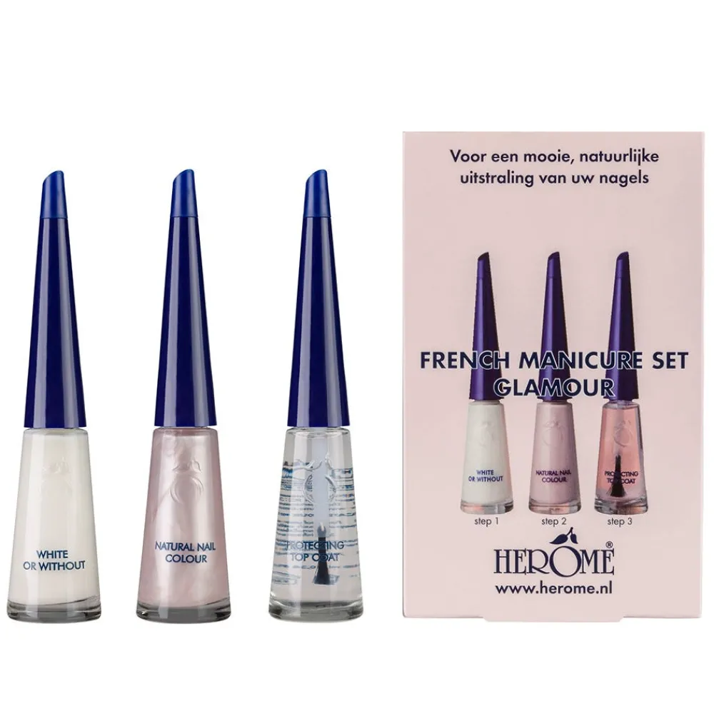 Das Herome French Manicure Set Glamour ist perfekt für einen glamourösen French-Manicure Look. Die Nägel werden mit einem zarten Perlmutteffekt lackiert, die Spitzen werden weiß akzentuiert und zum Schluß der schützende Decklack. Die Hände sehen gepflegt aus – auf natürliche, elegante Weise. Es beeinhaltet das Herome Perfect Nail Contour „White or Without“ 10 ml, die Herome Natural Nail Colour Pink 10 ml und die Herome Protecting Top Coat 10 ml.