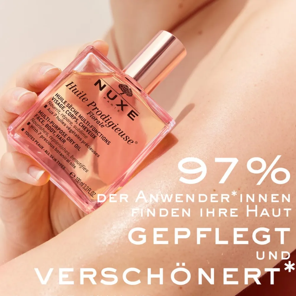 Die legendäre NUXE Huile Prodigieuse Floral Pflege mit 7 hochwertigen 100 % pflanzlichen Ölen präsentiert sich mit einem neuen zarten Blütenduft. Das feuchtigkeitsspendende Öl verwöhnt auch weiterhin mit der gleichen Trockenöltextur und überzeugt durch unveränderte Wirksamkeit für Körper, Gesicht und Haare. Seine antioxidative Wirkung, sein Schutzschild vor Umweltverschmutzungen* und seine abschwächende Wirkung auf Dehnungsstreifen machen es zu einem wertvollen Begleiter für Ihren Alltag. Die unnachahmliche Trockenöltextur offenbart sich mit der jüngsten Duftsignatur von Nuxe: Frische, florale Noten sorgen für einen neuen, genussvollen Wohlfühlmoment.