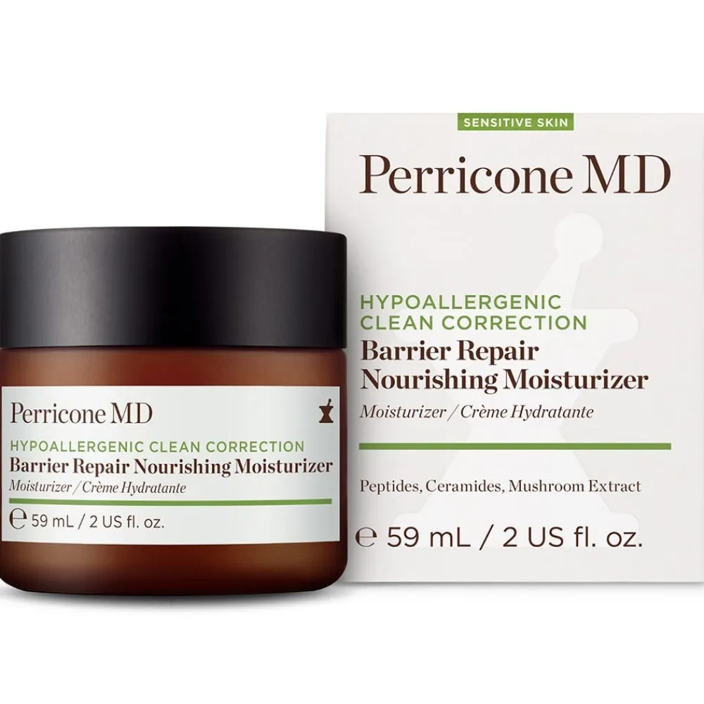 Perricone MD Hypoallergenic Clean Correction Barrier Repair Nourishing Moisturizer verbessert die Elastizität der Haut und mildert das Erscheinungsbild von Linien und Falten für einen straffen, geschmeidigen Teint. Sie wurde entwickelt, um Rötungen sichtbar zu reduzieren und die natürliche Feuchtigkeitsbarriere der Haut zu schützen, und hinterlässt selbst bei empfindlichster Haut ein gesundes, gepflegtes und beruhigtes Gefühl.