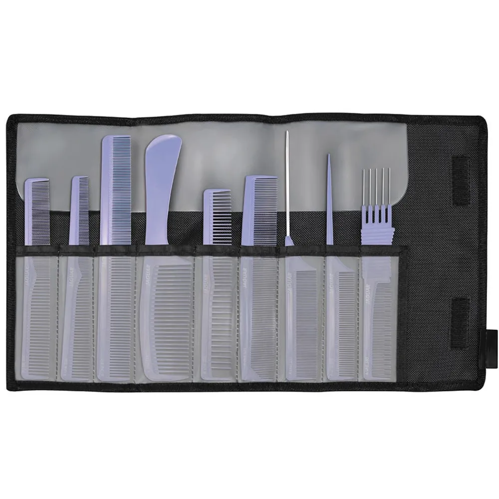 Der Jaguar Kamm-Set A-Line Lavender aus der professionellen ionische Kammlinie aus hochwertigem Kunststoff bestehend aus 9 verschiedenen Modellen Ionen helfen dem Haar Feuchtigkeit aufzunehmen und geben ihm einen gesunden und gepflegten Glanz. Zusätzliche Verrundungen der Zähne schonen Haare und Kopfhaut. Alle Modelle sind anti-statisch, resistent gegen Hitze und Chemikalien.