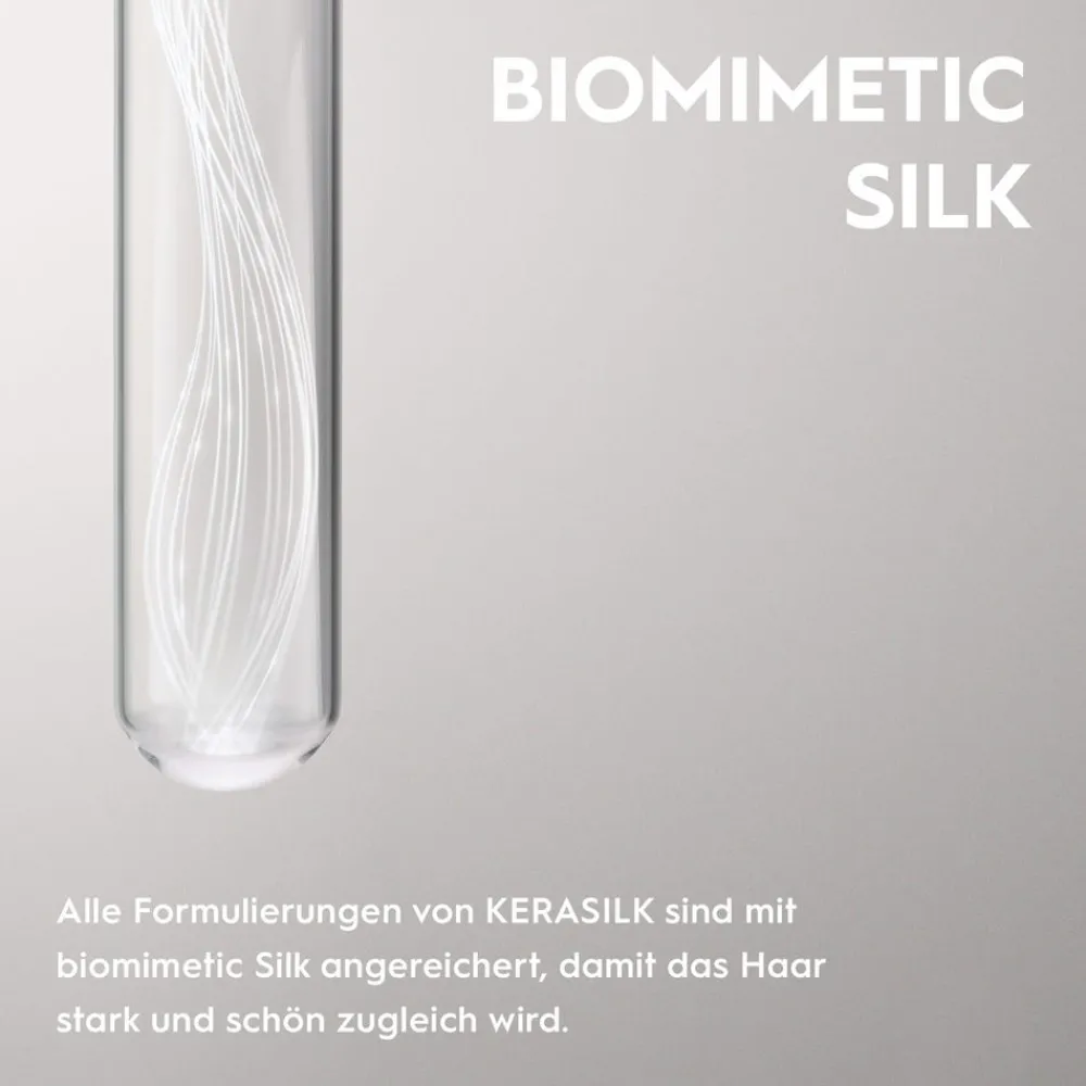 Durch Waschen, Kämmen, beim schlafen und bei Stress oder durch Umwelteinflüsse wie Sonne und Luftverschmutzung verliert das Haar auf natürliche Weise Aminosäuren. Die Folge: Es wird brüchig, stumpf und kraftlos. Die Kerasilk Formulierungen mit Biomimetic Silk machen das Haar stark und schön zugleich: Sie füllen die verlorenen Aminosäuren im Inneren der Haare und an der Schuppenschicht wieder auf. Bei jeder Verwendung von Kerasilk Produkten wird den Haaren neue Biomimetic Silk zugeführt. Das hilft, die Haarstruktur kontinuierlich zu verbessen auf dem Weg zu stärkerem und schönerem Haar.