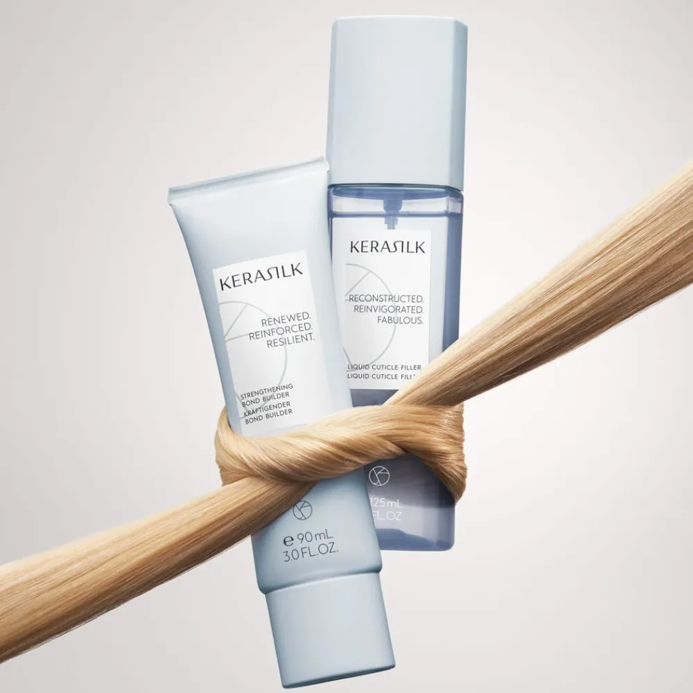 Das Kerasilk Deep Bond Repair Duo mit der Kombination des kräftigenden Bond Builder und dem Liquid Cuticle Filler sorgt für eine ganzheitliche strukturelle Erholung des Haares, sowohl an der Oberfläche als auch von innen, für starkes und gesund aussehendes Haar.