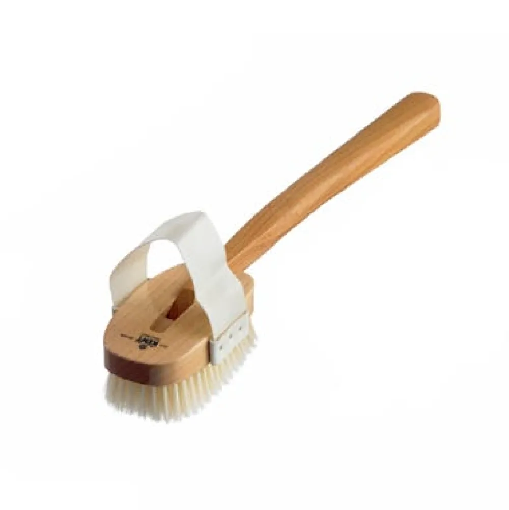 Ergonomische Badebürste mit abnehmbarem Stiel. Mit weissen Naturborsten und Handlasche.