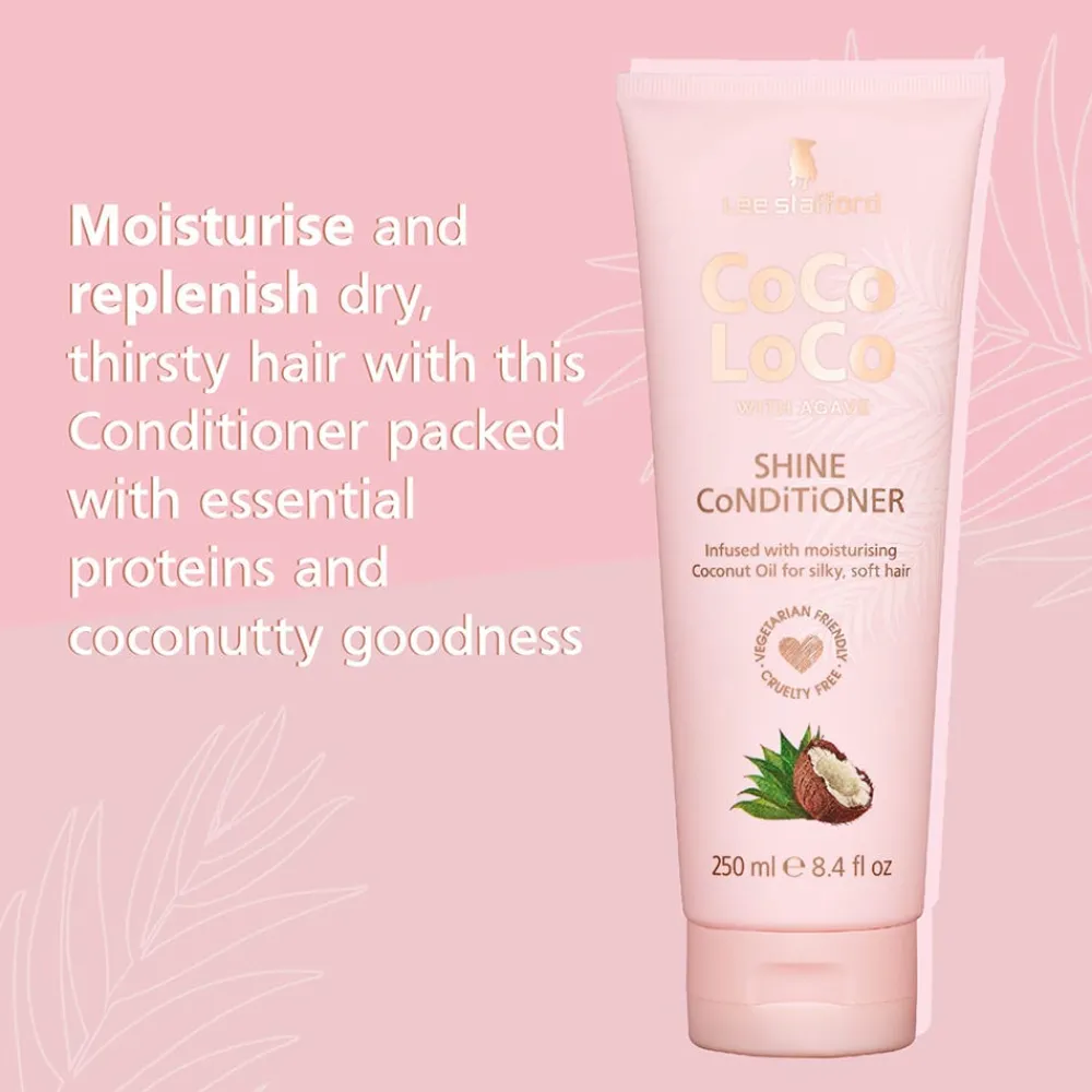 Der Lee Stafford Shine Conditioner speziell für trockenes und strapaziertes Haar. Mit einer kraftvollen Mischung aus Kokosnussöl und Agavenessenz liefert unser ultranährender Coco Loco & Agave Shine Conditioner eine Extraportion Feuchtigkeit für seidiges Haar, das weich, geschmeidig und voller Glanz ist. Mit einer leichten, cremigen Konsistenz gibt unser köstlich duftender Conditioner ausgetrocknetem Haar Feuchtigkeit und Geschmeidigkeit zurück, ohne es zu beschweren – ja, sogar feinem Haar! Unsere proteinreiche Formel ist sanft genug, um täglich Feuchtigkeit zu spenden. Sie belebt und regeneriert überstrapazierte Strähnen und versorgt das Haar gleichzeitig mit Feuchtigkeit und Glanz, damit es sich von der Wurzel bis zur Spitze gesund anfühlt. Unser süßer Kokosnuss- und Agavenduft ist langanhaltend, sodass er dich bei jedem Haarschwung an ein tropisches Reiseziel versetzt – das nennen wir ein Ergebnis! Kokosnussöl ist das ultimative Wunderöl. Reich an Laurinsäure, die eine natürliche Ähnlichkeit zum Haarprotein hat, ist es eines der besten Öle, um wirklich in den Haarschaft einzudringen. Es hilft, den Proteinverlust innerhalb der Kutikula zu reduzieren, was wiederum Schäden vorbeugt und dein Haar nährt und gesünder macht. Wiederherstellende Seidenproteine und Keratin verstärken den Pflegeeffekt, füllen das Haar auf, nähren es und schützen es vor Feuchtigkeitsverlust, damit es sich länger gesund anfühlt.