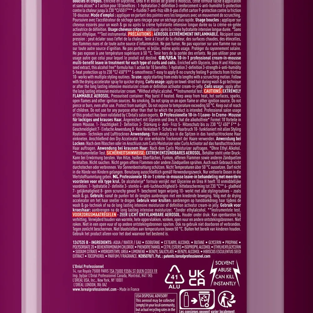 Das L’Oréal Professionnel Paris Curl Expression 10in1 Cream-in-Mousse ist eine 10in1 Leave-In Creme-Mousse und wurde speziell für lockiges, welliges und krauses Haar entwickelt.