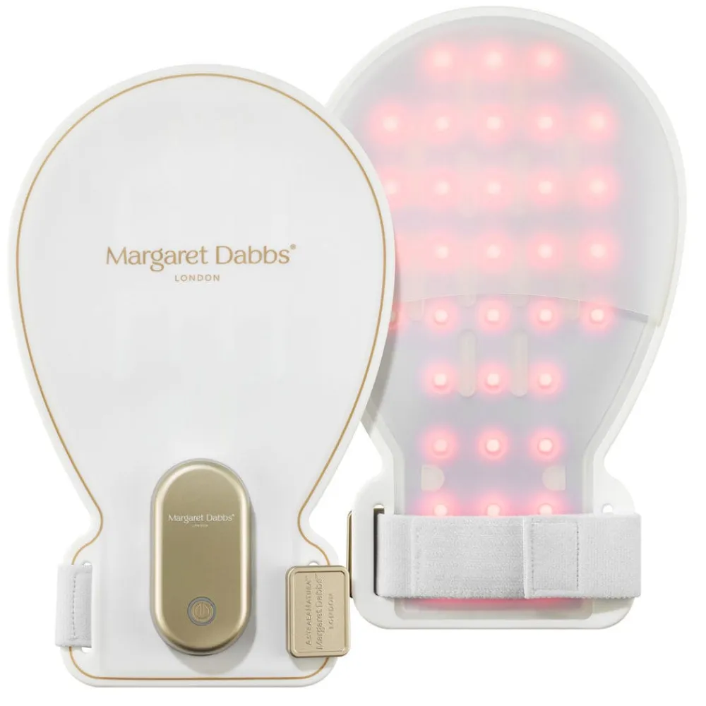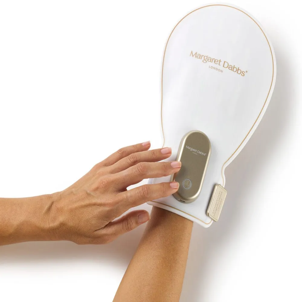 Erlebe Margaret Dabbs ASTRAEANATURA LED Hand Mitts, ein revolutionäres Handbehandlungsgerät, das mit einer leistungsstarken Lichttherapie die Hautgesundheit verbessert und deine Hände verjüngt. Zwei konturierte, batteriebetriebene Silikonhandschuhe passen bequem über den Handrücken und strahlen wahlweise rote oder grüne Wellenlängen aus. Diese Wellenlängen verbessern das Aussehen, die Qualität und das allgemeine Wohlbefinden der Haut in nur 10 Minuten täglicher Anwendung. Beobachte , wie Pigmentierung, feine Linien und Falten reduziert werden, während gereizte, rissige und wunde Haut beruhigt wird und ein strahlendes und jugendliches Aussehen erhält. Diese revolutionäre Handbehandlung ist einfach in der Anwendung und macht es leicht, AstraeaNatura in deine tägliche Hautpflegeroutine einzubinden, um schnelle, professionelle und sichere Ergebnisse zu erzielen, die denen einer Margaret Dabbs Klinik in London ähneln. Verbessere den Zustand deiner Hände bequem von zu Hause aus mit dieser luxuriösen Handbehandlung von Margaret Dabbs London. Dieses Produkt wird mit einem Reiseetui geliefert, damit du die Ergebnisse auf Spa-Niveau überallhin mitnehmen können.