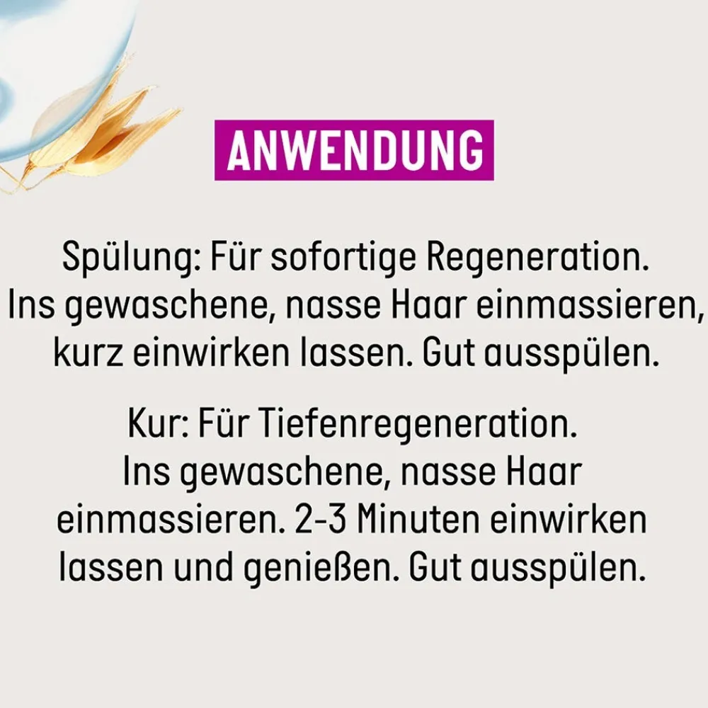 - Spülung – Für sofortige Regeneration. Insgewaschene, nasse Haar einmassieren, kurz einwirken lassen und anschließend gut ausspülen