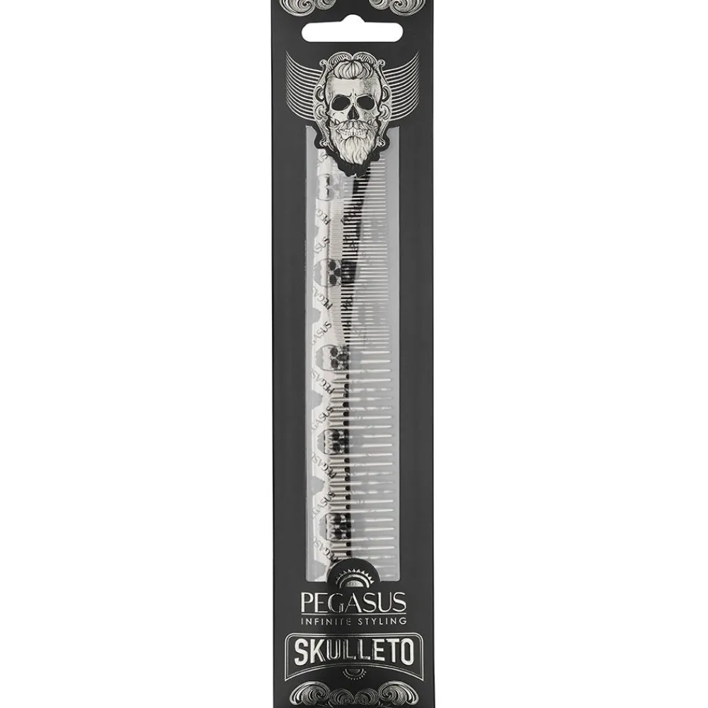 Pegasus Skulleto 201 silber Haarschneidekamm mit dem charakteristischen Totenkopf-Print. Dieser stylische Kamm wurde handgearbeitet und ist dadurch gratfrei mit perfekt abgerundeten Zähnen, die Haare und Kopfhaut schonen. Das aus Naturkautschuk hergestellte Ebonit gibt dem Haarschneidekamm die perfekten Eigenschaften: Elastisch, leicht und stabil, höchst hitze- und chemikalienbeständig sowie robust und langlebig.