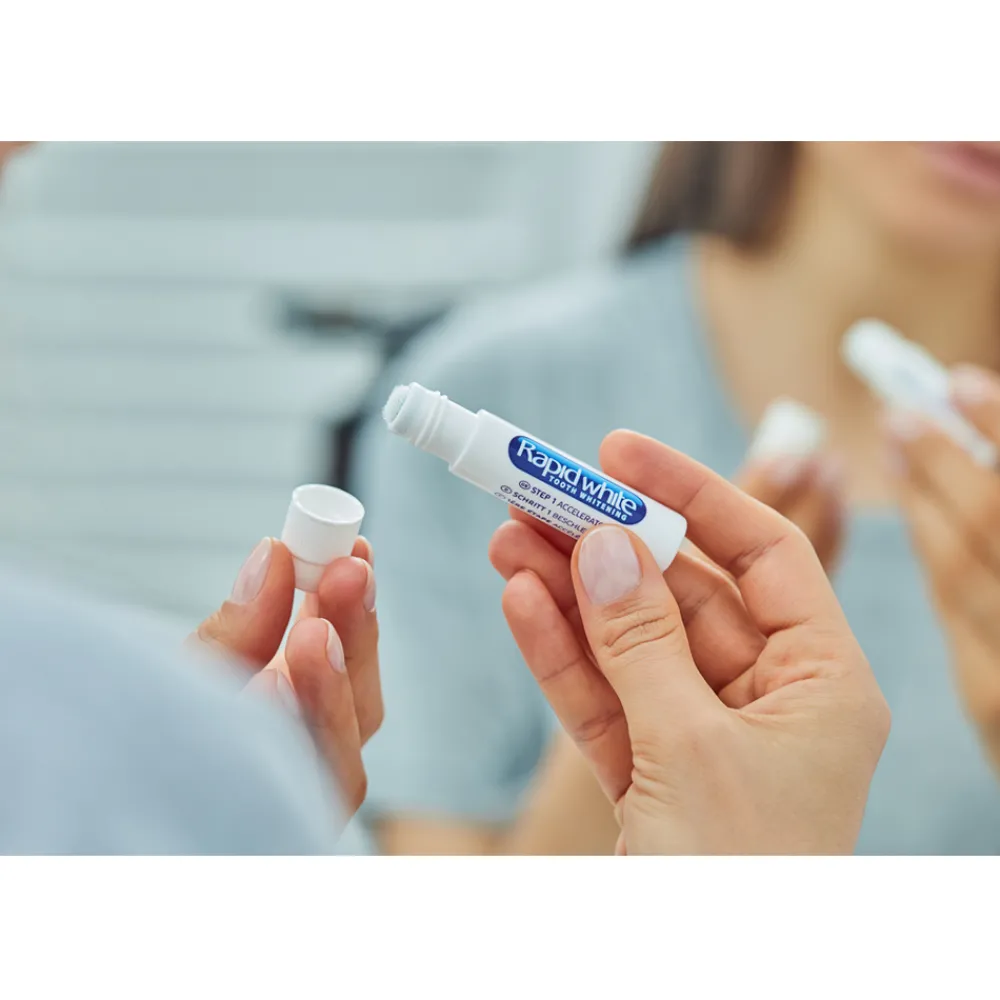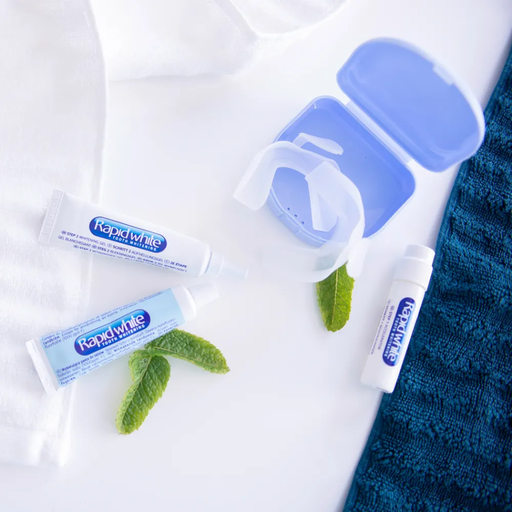 Das Rapid White Bleaching Power Set ist für sofortige Zahnaufhellung ohne Wasserstoffperoxid geeignet. Mit maximalem Effekt – bis zu 7 Stufen. It’s time to smile. Ein Lächeln ist unumstritten die schönste Art Zähne zu zeigen. Oftmals jedoch hinterlassen Genussmittel wie Kaffee und Tee unschöne Verfärbungen auf dem Zahn. Das leistungsstarke Rapid White Bleaching Power Set ermöglicht um bis zu sieben Stufen weißere Zähne. Mit dem Set werden die Zähne leicht und unkompliziert im Do-it-yourself-Verfahren wieder weißer. Ein wirksames Verfahren, das für den bequemen Einsatz Zuhause geeignet ist. Ohne zeit- und kostenintensiven Zahnarztbesuch kannst Du Deine Zähne von Zuhause aus zum Strahlen bringen. Das Rapid White Bleaching Power Set überzeugt mit seiner maximalen Performance und beeindruckendem Doppeleffekt: bereits nach nur einer Woche 2 x täglicher Anwendung strahlen die Zähne bis zu 7 Stufen weißer. Darüber hinaus ermöglicht die Aufhellungszahncreme einen Soforteffekt von bis zu 3 Stufen hellere Zähne.