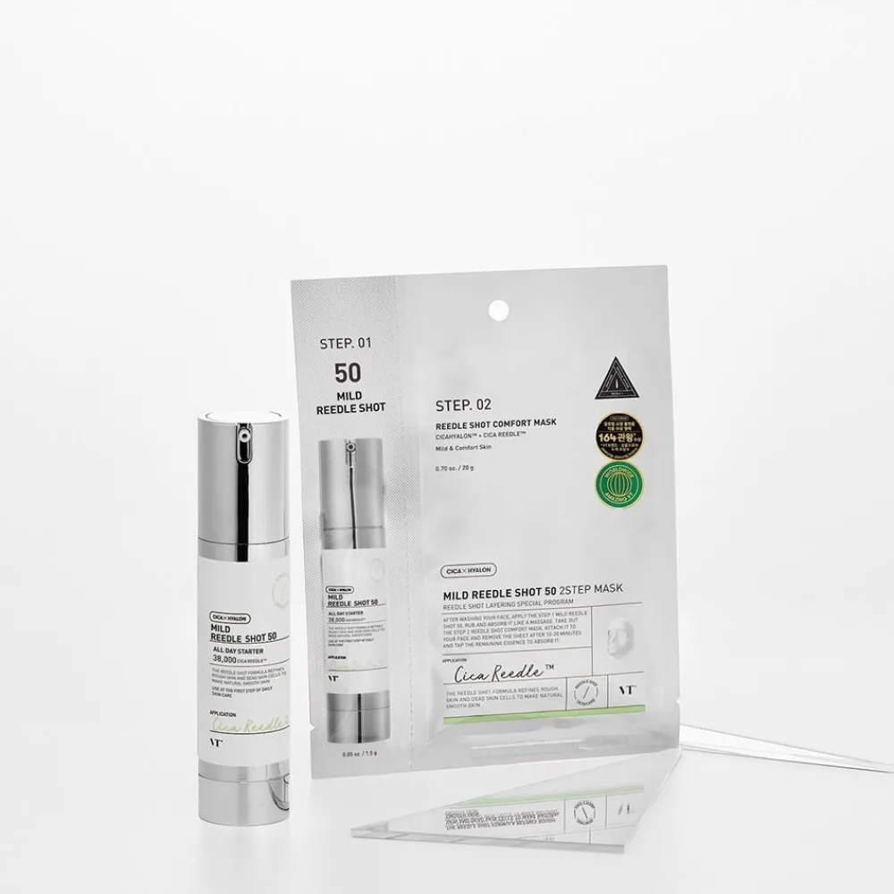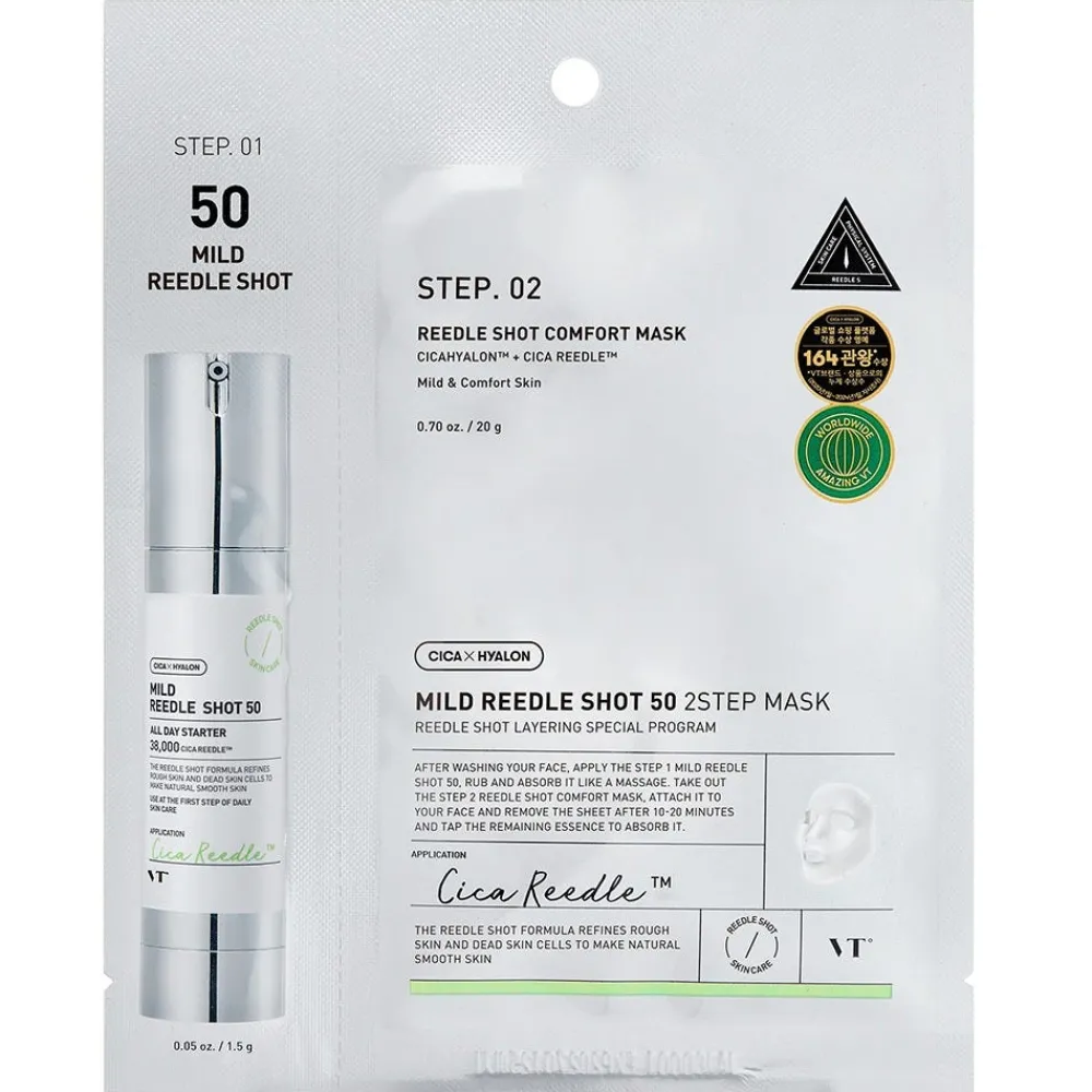 Die VT COSMETICS Reedle Shot 50 2-Step Mask ist eine innovative zweistufige Gesichtsbehandlung, die fortschrittliche Mikronadeltechnologie mit beruhigenden Inhaltsstoffen vereint, um die Hautstruktur sichtbar zu verbessern und langanhaltende Feuchtigkeit zu spenden. Im ersten Schritt sorgt die Reedle Shot 50 Essence mit 237.500 ultrafeinen CICA-Mikrosphären (14-mal kleiner als Poren) für eine maximale Aufnahme aktiver Wirkstoffe. Angereichert mit CicaHyalon™ – einer Kombination aus Centella Asiatica und drei Arten von Hyaluronsäure – wirkt sie beruhigend, hydratisierend und stärkt die Hautbarriere. Der zweite Schritt, die Balance Sheet Mask, intensiviert die Wirkung der Essenz, speichert Feuchtigkeit, nährt die Haut und sorgt für ein ausgeglichenes, frisches Hautgefühl. Ideal auch für empfindliche Haut, die eine intensive, sanfte Pflege benötigt.